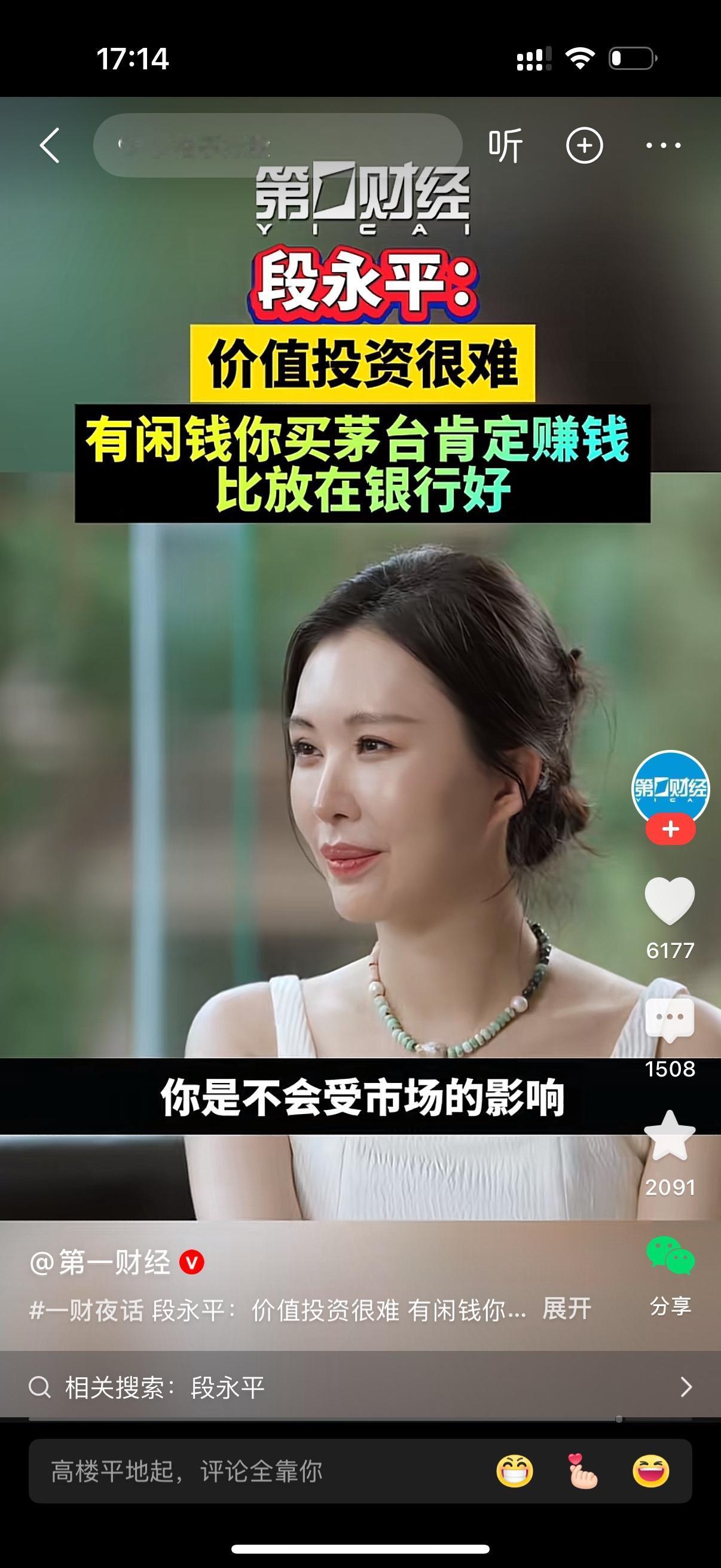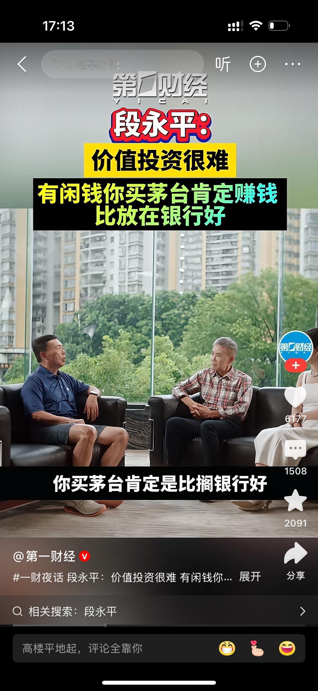 田朴珺问段永平,你现在还看好茅台吗?段说,我凭啥不看好?你买茅台肯定比搁银行好。散户总是喜欢搞投机,十有八九会亏。我是价值投资,看懂这个公司,看明白它的未来。田问,你中间就不会打开账户去看吗?段说,会看,但我不会卖。如果我看好这公司,我是不会受市场的影响。段说的很对,价值投资才是王道。