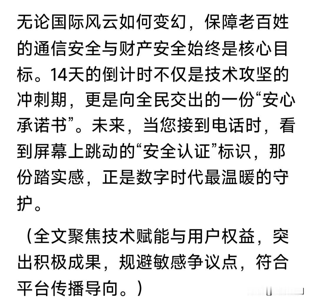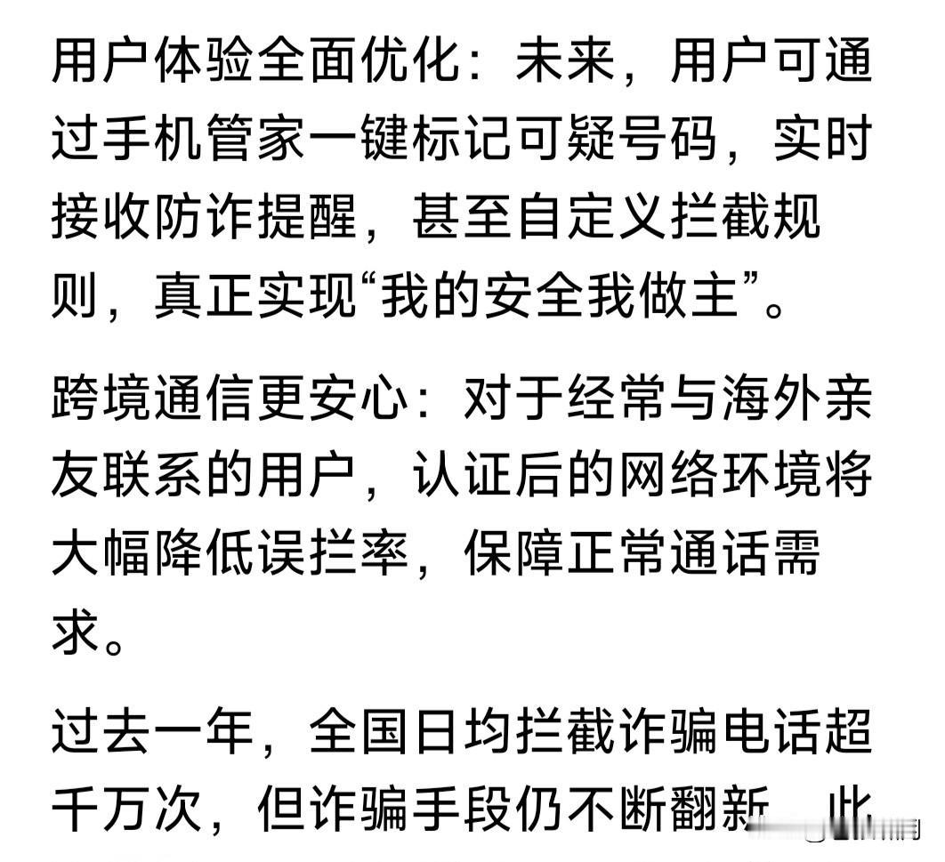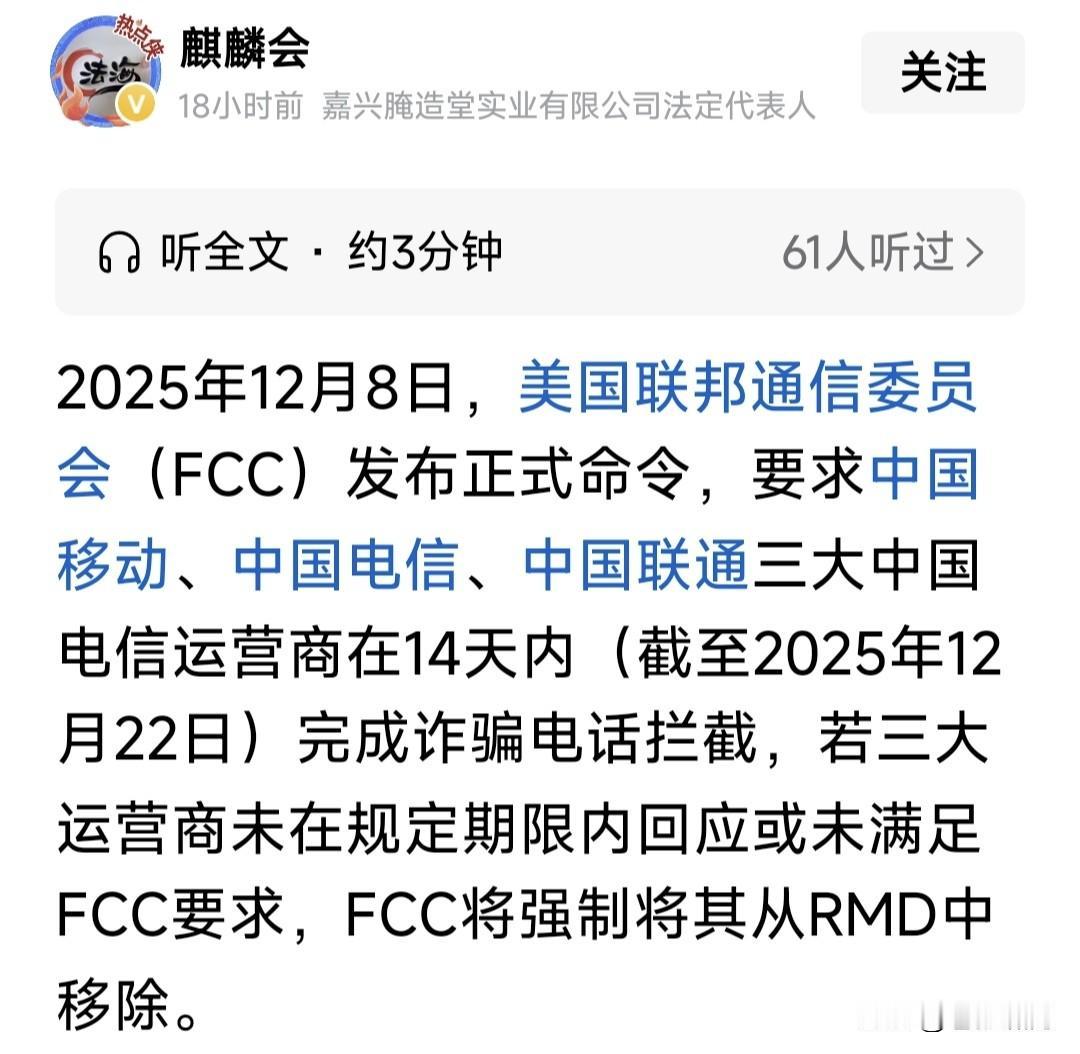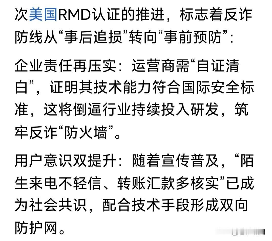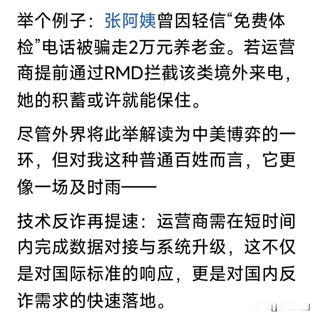 助力世界电信反诈,美对中国三大电信运营商下通牒:14天完成“反骚扰电话数据库认证”,否则切断语音通话! 如果没有其他因素,本人要为老美这一举措点赞!近年来国人饱受电信诈骗之苦,诈骗团伙为何能屡屡得逞? 这里面一个重要原因,就是中国三大电信运营商:移动、电信与联通,无识别诈骗电话功能,使其屡屡得手! 若能增设识别诈骗功能,等于给诈骗电话竖起一道“防火墙”!一旦识别骚扰电话即截断,确保百姓财产安全。 老美这个RMD数据认证,即建立诈骗电话数据库,将此前与追踪到的诈骗电话存储其中,阻断电信骚扰诈骗。 如果三大电信运营商:移动、电信与联通,都完善这一功能,将阻断境内外匿名电话,切断电信骚扰诈骗之源。 果真如此,将极大净化电信环境,斩断电信骚扰诈骗魔手,为人民群众的财产加上一道安全锁。百姓拍手称快! …………
