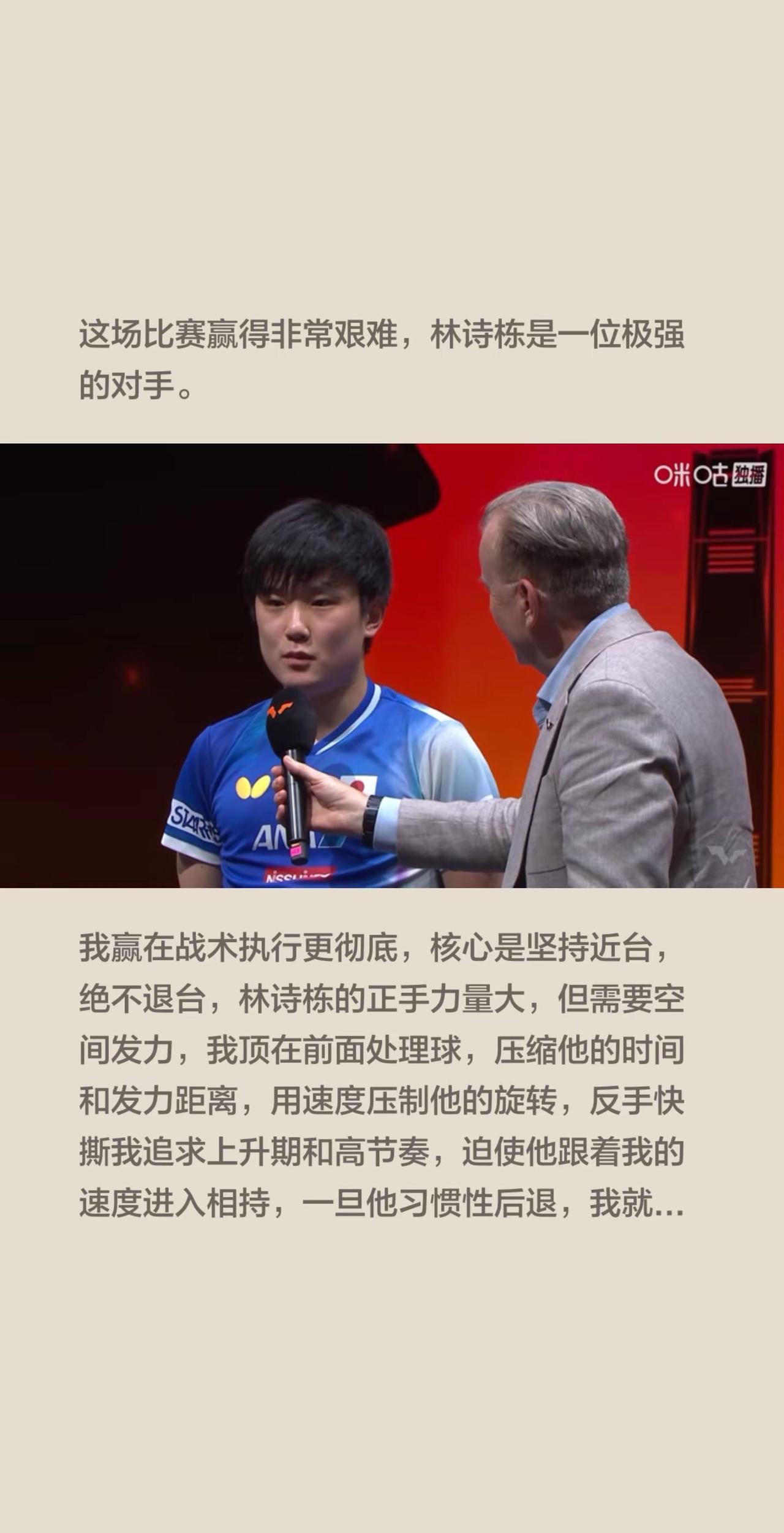 张本智和4-3林诗栋,赛后采访说到点子上。这场比赛赢得非常艰难,林诗栋是一位极强的对手。我赢在战术执行更彻底,核心是坚持近台,绝不退台,林诗栋的正手力量大,但需要空间发力,我顶在前面处理球,压缩他的时间和发力距离,用速度压制他的旋转,反手快撕我追求上升期和高节奏,迫使他跟着我的速度进入相持,一旦他习惯性后退,我就掌握了主动。关键分的博弈是分水岭,第一局他10-7领先,我通过搏杀变线扭转了局面,决胜局8-8后,我选择发长球偷袭,这很冒险,但必须打破常规节奏,林诗栋在关键分有时会依赖习惯线路,比如正手斜线,这给了我预判和准备的机会,我的策略是:越是关键分,越要坚决变化。我在接发球上做了针对性准备,林诗栋的发球以短球为主,旋转变化可以更丰富,我接发球时尽量采用挑打或劈长,避免陷入他的摆短控制,争取直接进入我擅长的速度相持,比赛中我偷袭了几个长球,效果不错,因为他处理这类球有时不够果断,衔接偏慢。从比赛来看,林诗栋的技术非常厚实,他的反手相持能力强,中远台正手拉球质量很高,这也是他能在0-2落后时扳平的原因,他的抗压能力在进步。但他的一些习惯性短板,在这场比赛中被放大了,首先是位置问题,他习惯性退台,这在面对速度型打法时是致命的,退台意味着失去节奏和速度优势,被动进入防守,其次是线路组织,他的正手和反手相持中斜线比例过高,线路变化不够突然,这让我的防守准备很充分,如果他能在高速对抗中增加直线和追身球,威胁会大很多。另一个明显的问题是节奏单一,在高速相持中,他倾向于用力量硬扛,缺少轻重结合、突然的节奏变化,这让我很容易适应并持续施加压力,现代顶尖对抗,必须在速度中融入变化。心理层面,他比以往更顽强,但关键分的决策清晰度还有提升空间,比如决胜局末尾,可能需要一个更明确的战术来打破僵局,而不是延续之前的模式,我在这场比赛中也面临压力,比如鹰眼挑战,我的方法是只专注下一分。我们交手多次,彼此非常熟悉,他输掉的一些接近比赛,往往在于细节:退台后的转换偏慢,关键分变化不足,这些也正是他未来可以突破的地方,如果他能在近台速度和战术灵活性上再进一步,我们的对抗会更加激烈。对我而言,胜利来自赛前准备和临场决断,我研究了他的习惯落点,比赛中尽量把球送到他的中间位和反手大角,限制他舒服地侧身使用正手,相持中,我尤其注重第一板的质量,不给他轻松上手发动进攻的机会。这场比赛没有失败者,林诗栋展现了顶尖的潜力和韧性,我赢在战术针对性和关键分的处理上,乒乓球是不断进化的,他还很年轻,有足够的时间变得更强,期待我们下一次的交手。