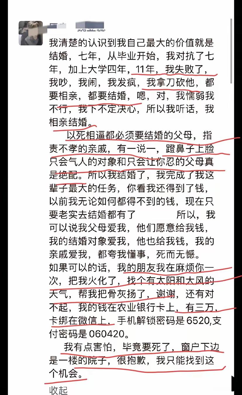 媒妁之言,父母之命 已经不适应当代婚恋观,婚恋自由不能只是一句空话!长辈为了私心干预后代婚恋自由的应该入刑,不能让悲剧接二连三发生。 中国父母受到女大当嫁,男大当婚传统思想的影响,一直都在干预后代的婚姻自由,只要到了婚嫁的年龄就会催婚,年轻人被催的心烦意乱,有些人被逼无奈对婚姻选择随意,也是对婚姻不负责任,导致婚后不快乐,可是父母的任务完成了没有任何包袱了。 中国很多父母都是为了所谓的完成任务,强迫子女结婚,他们不会管子女结婚是否意愿,是否幸福,这些父母是自私自利的。 山东高中女教师结婚当天选择轻生,从她的朋友圈留言可以看出来她11年来一直抗拒结婚,甚至跟父母闹了矛盾,极端的事情也做过,但父母以死相逼,女老师为了父母的脸面只有不情愿的选择结婚,最后选择了轻生。最后她父母失去女儿肯定也很伤心,但这样的结果都是她们逼的,中国父母太为子女操心了,要学会放手,说服不了孩子,那就尊重孩子的意见。
