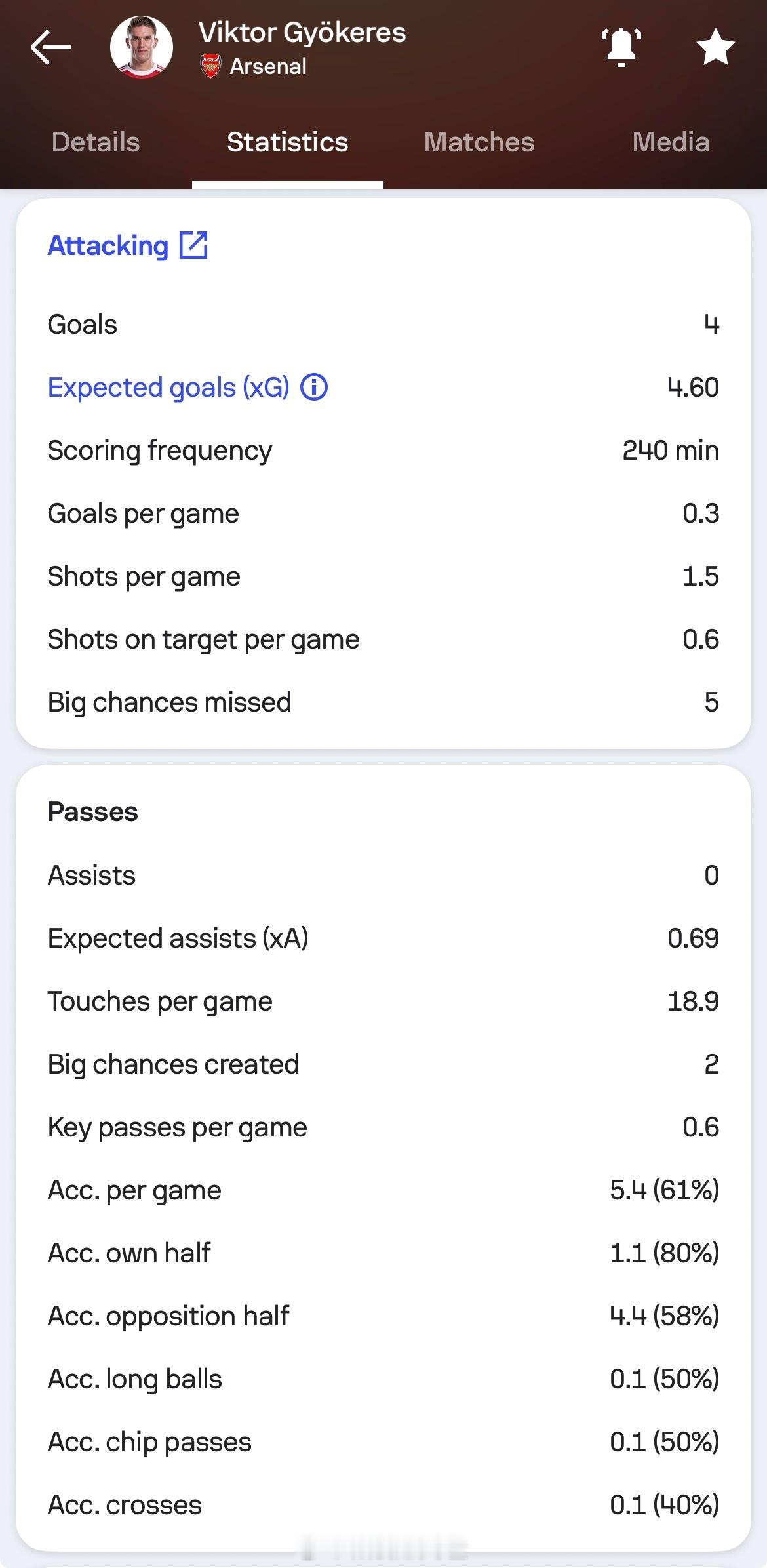 Squawka统计:对阵狼队的上半场仅有四名阿森纳球员成功传球给约克雷斯:◉ 因