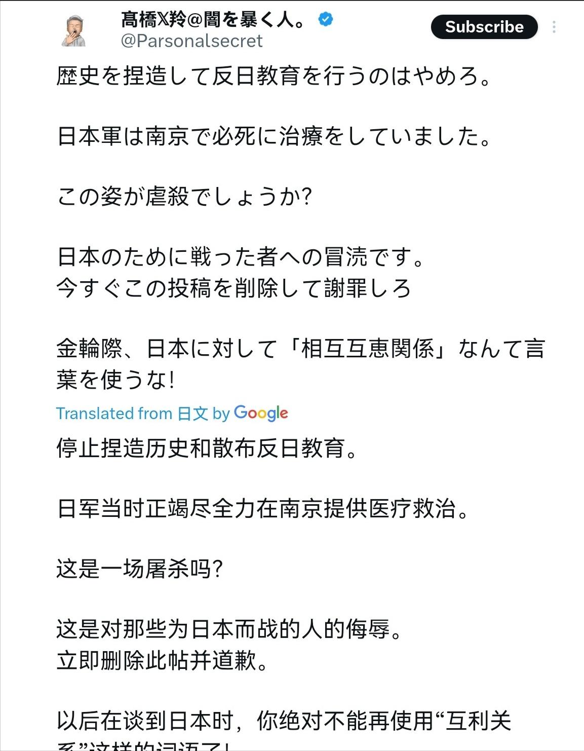 南京大屠杀死难者国家公祭日当天,日本右翼分子高桥羚阁抛出的言论让人愤慨不已,他不仅要求停止所谓“捏造”历史和反日教育,还颠倒黑白称日军当年在南京“拼尽全力”救治民众,甚至指责相关表述是对日本先辈的亵渎,要求删除帖子并道歉,否定中日互利共赢的可能。 这番谬论并非个例,近期日本参政党党首神谷宗币、右翼学者藤冈信胜等人也多次公开否认南京大屠杀,将侵略美化为“自卫”。 这些言论在网络上引发轩然大波,国内网友纷纷谴责这种对历史的公然践踏,也有部分声音呼吁区分普通日本民众与右翼势力,避免加剧对立。 俄罗斯外交部发言人扎哈罗娃也明确表态,南京大屠杀历史事实不容置疑,任何篡改行为都应受到国际社会谴责。 事件本质是日本右翼势力试图歪曲二战历史、逃避侵略罪责,这种行为不仅伤害了受害国人民的感情,也给地区和平稳定带来隐患。面对铁证如山的历史,右翼分子为何还敢如此嚣张? 日本右翼否认历史的言论能在当地获得传播空间,核心症结就在历史教育的系统性缺失。 日本的教科书审定制度长期淡化侵略事实,2014年修订的《教科书审定标准》要求对“存在不同说法”的历史数字避免明确表述,导致多数教材仅以“南京事件”相称,用“许多”“尚未确定”等模糊词汇描述遇难人数,完全不提30万这个铁证如山的数字。 更有教材直接抹去相关历史,让不少日本年轻人对南京大屠杀一无所知,甚至将其误解为“铁路炸弹事件”。 曾担任中学历史老师几十年的糀谷阳子透露,日本孩子大多不知道卢沟桥事变、九一八事变,提到战争只会想到偷袭珍珠港,被问及日本战败对象时,几乎都回答是美国而非中国。 这种教育断层让右翼言论有了生存土壤,就像前东京新宿区议员长谷川顺一所说,现在日本年轻人连靖国神社的真实性质都不清楚,只当是普通神社参拜。 除了教育漏洞,右翼势力还通过成立“新历史教科书编撰会”等组织,编写美化侵略的教材,攻击客观记述历史的做法是“自虐史观”,这种长期的舆论渗透,让歪曲历史的观念在部分日本社会扎下根来。 日本一边大肆纪念原子弹爆炸遇难者,塑造“受害者”形象,一边极力回避南京大屠杀的罪责,这种双重叙事背后藏着明确的政治和社会诉求。 从政治层面看,这种叙事能帮助日本摆脱“加害者”标签,淡化战争责任,为其扩军、修改和平宪法等行为铺路。 右翼政客如高市早苗等人,不仅频繁参拜靖国神社,还否认慰安妇强征事实,主张建立“国防军”,其言行正是这种叙事的具体体现。 从社会心理来说,强调自身“受害”经历能凝聚国内情绪,转移民众对历史罪责的关注,避免因正视罪行引发的社会撕裂。 但这种割裂的历史观完全站不住脚,原子弹爆炸是日本发动侵略战争的直接后果,而南京大屠杀是日军主动犯下的反人类罪行,两者有着本质区别。 日本不愿承认,是因为正视南京大屠杀就意味着要承担战争赔偿、历史道歉等一系列责任。 而塑造“受害者”形象则能让其在国际社会博取同情,这种自私的历史态度,正是其难以获得亚洲邻国真正谅解的关键。 面对日本右翼的历史修正主义,国际社会不能只停留在舆论驳斥,更要采取切实行动推动历史真相的传播。 史料共享是重要路径,就像日本友人大东仁法师20年捐赠4000份侵华史料那样,各国可联合建立二战历史档案数据库,让铁证跨越国界被更多人知晓。 国际法庭的案例也应被反复重申,东京大审判早已对南京大屠杀的罪行作出明确认定,这些司法结论是驳斥历史虚无主义的重要武器。 民间交流同样不可或缺,通过举办跨国历史研讨会、青少年历史寻访活动等,让日本年轻人有机会接触到教科书之外的真实历史,打破右翼势力制造的信息茧房。 部分日本有识之士已经在行动,早稻田大学附近的女性战争与和平资料馆,专门展示日军性暴力的证据,吸引不少日本学生主动了解历史真相。 中国坚持举行国家公祭日,不仅是为了缅怀遇难同胞,更是在向世界传递捍卫历史真相的决心,这种坚持能倒逼日本社会正视历史,也能让国际社会更清晰地认识到历史修正主义的危害。 铭记历史从不是为了延续仇恨,而是为了防止悲剧重演,日本右翼势力的倒行逆施,不仅违背了人类良知,也在伤害两国人民的感情基础。 历史真相不会因为否认而消失,南京大屠杀的档案、证人证言、实物证据早已构成完整的证据链,成为全人类共同的历史记忆。 任何试图篡改历史、美化侵略的行为,最终都会被钉在历史的耻辱柱上。唯有正视历史、承担责任,才能真正实现地区的持久和平,这是日本需要明白的基本道理,也是国际社会的共同期待。 历史的审判可能迟到,但绝不会缺席,那些妄图歪曲历史的势力,终究会被历史的洪流所淹没。 你认为国际社会还能通过哪些方式推动日本正视历史?对于日本的双重历史叙事,你有什么看法? (本文信源:高桥羚阁发文)