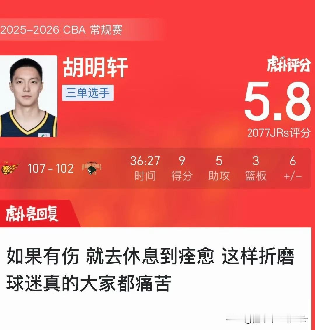 我呼吁球迷要给胡明轩多一点时间,他在场上很多作用是数据体现不出来的, 广东借主场加时险胜同曦,赛后球迷论坛对胡明轩表现评价有些扎耳,假如有伤就不要勉强,阵地战把整个球队节奏磨没了;恕我直言,广东宏远后场真正大脑是徐杰,就像是国家队,多次证明胡明轩他不是双能卫,更不能客串组织后卫,四场打韩国比赛,不合适球员,就不该放在错误位置