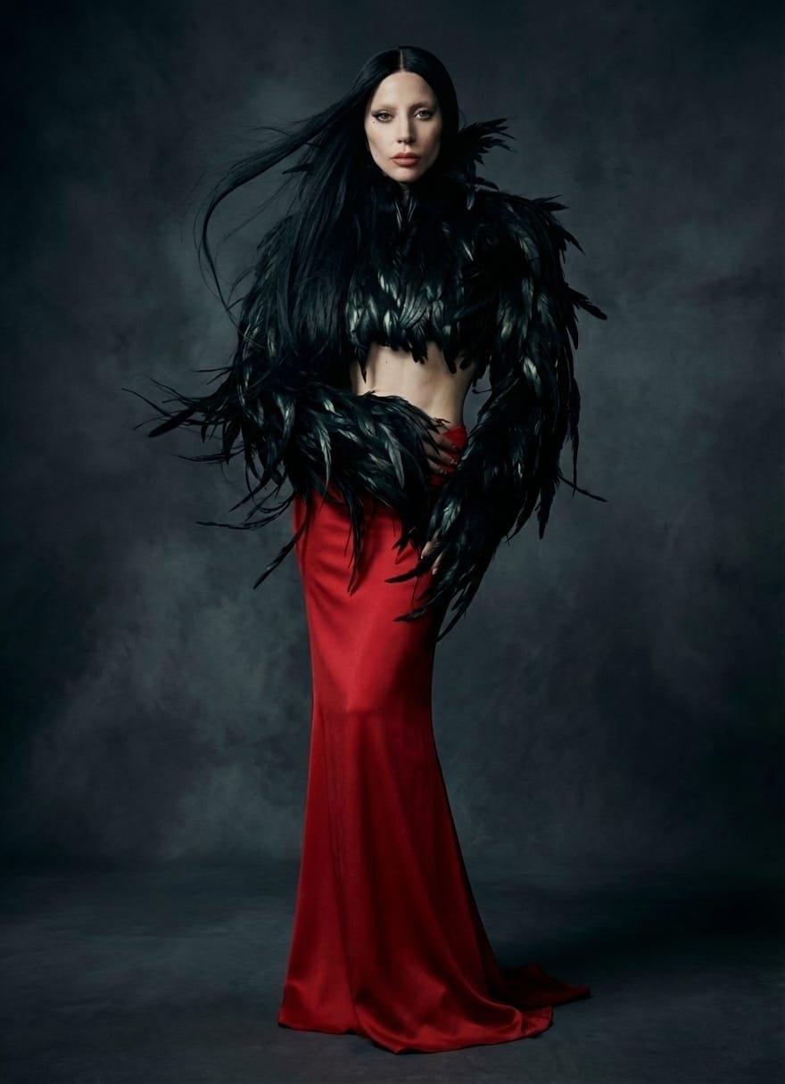 Lady Gaga 造型变时髦了,气场很强!这个造型以红黑撞色打造出极具张力的视觉效果,黑色羽毛构成夸张的上装廓形,蓬松的羽毛自带野性与奢华感,露腰设计又添几分柔媚;搭配正红色拖地长裙,明艳的红与冷峻的黑形成强烈反差,裙摆垂坠感与羽毛蓬松感互补。冷艳妆容加持下,复古奢华与先锋叛逆交织,红毯气场拉满。