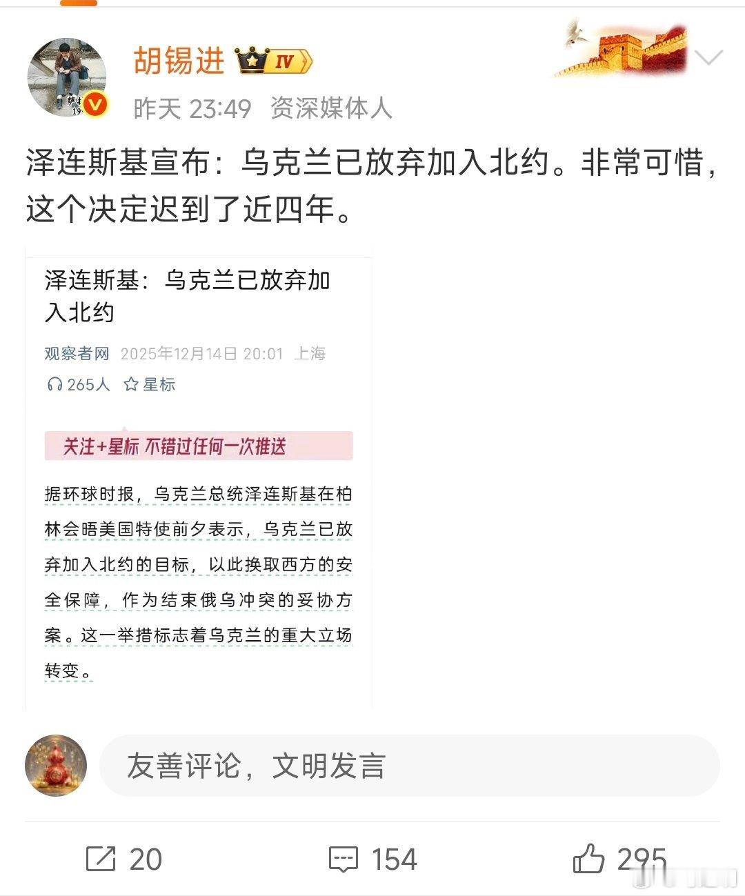 胡锡进老师说:“泽连斯基宣布:乌克兰已放弃加入北约。非常可惜,这个决定迟到了近四年。”如果泽连斯基现在跪地投降, 胡老师会不会说“本应1小时22分钟结束的战斗,被泽连斯基捣乱,四年都无法结束?”老胡对俄国人是真爱。只是不知慕强背后的姿势能不能好看一点?
