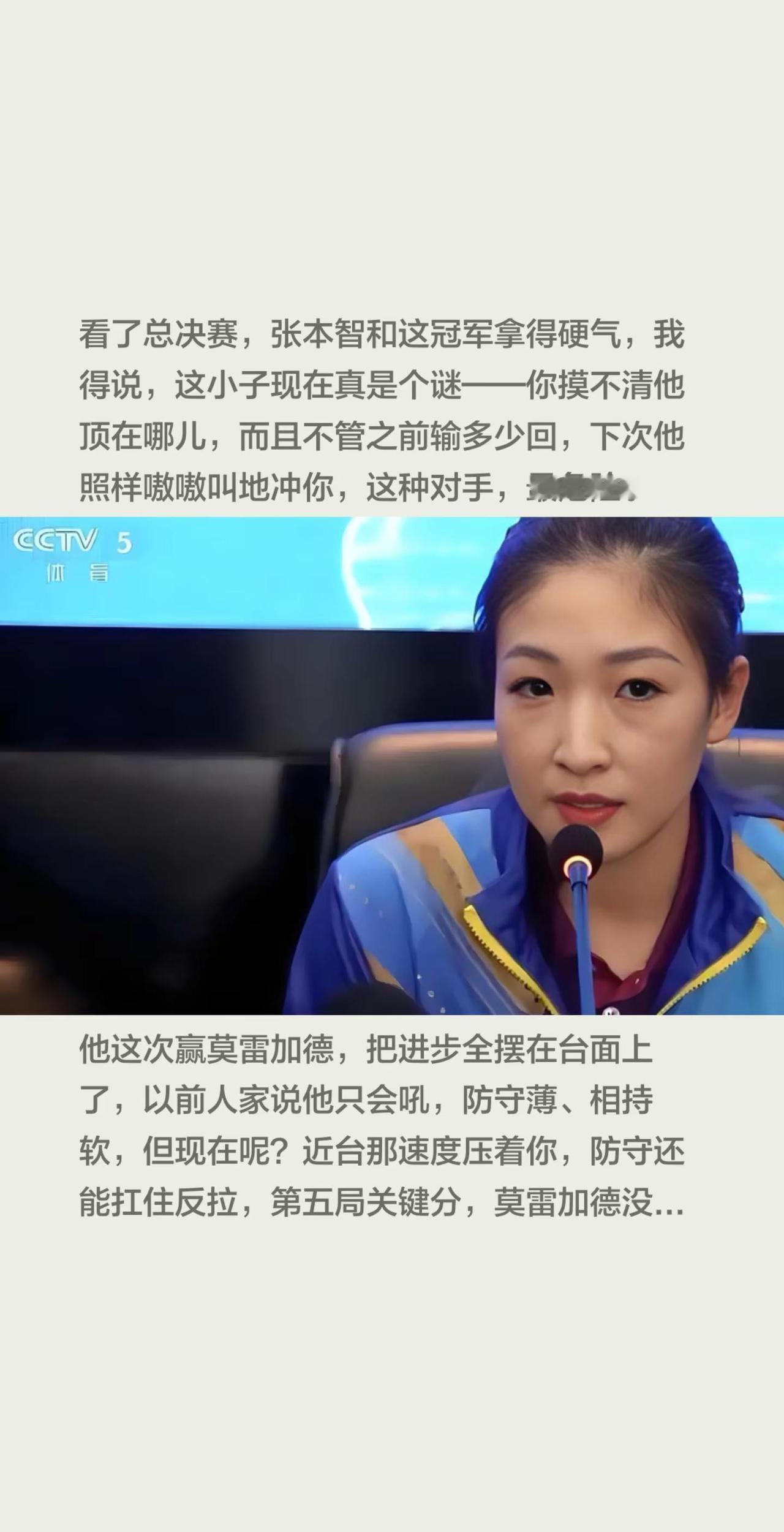 刘诗雯评价张本智和:他的实力真的是个迷。看了总决赛,张本智和这冠军拿得硬气,我得说,这小子现在真是个谜,@你摸不清他顶在哪儿,而且不管之前输多少回,下次他照样嗷嗷叫地冲你,这种对手,最危险。他这次赢莫雷加德,把进步全摆在台面上了,以前人家说他只会吼,防守薄、相持软,但现在呢?近台那速度压着你,防守还能扛住反拉,第五局关键分,莫雷加德没拿下,他立刻抓住机会,一口气打崩对手,这说明什么?技术厚了,心态稳了,冠军的料子成了。他早就破过纪录,最年轻的总决赛冠军,赢林高远,赢这次,不是靠运气,是实打实练出来的,他们兄妹俩把国际乒坛的关注度都带高了,这是好事,但对我们国乒来说,这就是一面镜子,照出咱们自己的问题。咱们现在得清醒,队员有伤病,新老在交替,这是现实,但对手不等人。张本这种近台快攻结合强硬相持的打法,已经成为体系,我们如果速度跟不上,质量出不来,相持占不到便宜,那就只剩被动。我看咱们现在最缺两点:一是针对性训练,张本这速度怎么破?他防守变强了怎么打穿?教练组得拿出具体办法,不能光喊“要拼”,二是队员的危机感。场上那股“释放”不是喊出来的,是技术底气撑着的,咱们年轻队员打硬仗、关键分的能力,还得练。张本有个最厉害的地方:他好像没有“信心包袱”,输你二十次,第二十一次照样全力以赴。这种心态,是运动员最宝贵的,咱们的队员有时候想赢怕输,包袱反而重了。赛事告一段落,队员能缓口气,但咱们的思考不能停,张本这个冠军是个信号:世界乒坛的竞争方式在变,咱们的霸主地位,是拼出来的,不是保出来的。总之,国乒得抓紧了,对付张本这种上限高、心态强的对手,唯有练得更狠,钻得更细,斗得更聪明,下次见面,球场上看真章。