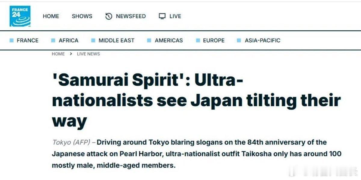 高市政权下的日本,西方媒体终于察觉到不对劲了…日本首相高市早苗在二战历史问题上存在明显的极右翼立场,其 “朋友圈” 和支持者中更不乏公然否认南京大屠杀、为偷袭珍珠港洗地的极右翼分子,对于这些,不少西方媒体在涉及日本的报道中出现了“选择性失明”。近期,法新社察觉到了高市政权下的日本有些不对劲……在一篇12月12日刊登的标题为《“武士精神”:极端民族主义者认为日本正朝着他们的方向倾斜》的报道中,法新社采访了一个名为“大行社”的日本极右翼团体。据介绍,这个在日本偷袭珍珠港84周年之际,专门跑去靖国神社参拜的极右翼群体有100多名成员,其中大多是中年男性。法新社表示:“在高市早苗领导下,(日本)主流政治近期出现的右倾转向意味着,他们(“大行社”)的部分论调(在日本)突然间似乎没有那么边缘化了。”法新社进一步描述称,自高市早苗上台后,她不仅“挑起了与中国的争端”,还准备出台更加严格的法规限制外国人。不仅如此,主张“日本人利益优先”的日本反移民政党“参政党”,也在这一时期迅速获得支持。热点观点海外新鲜事