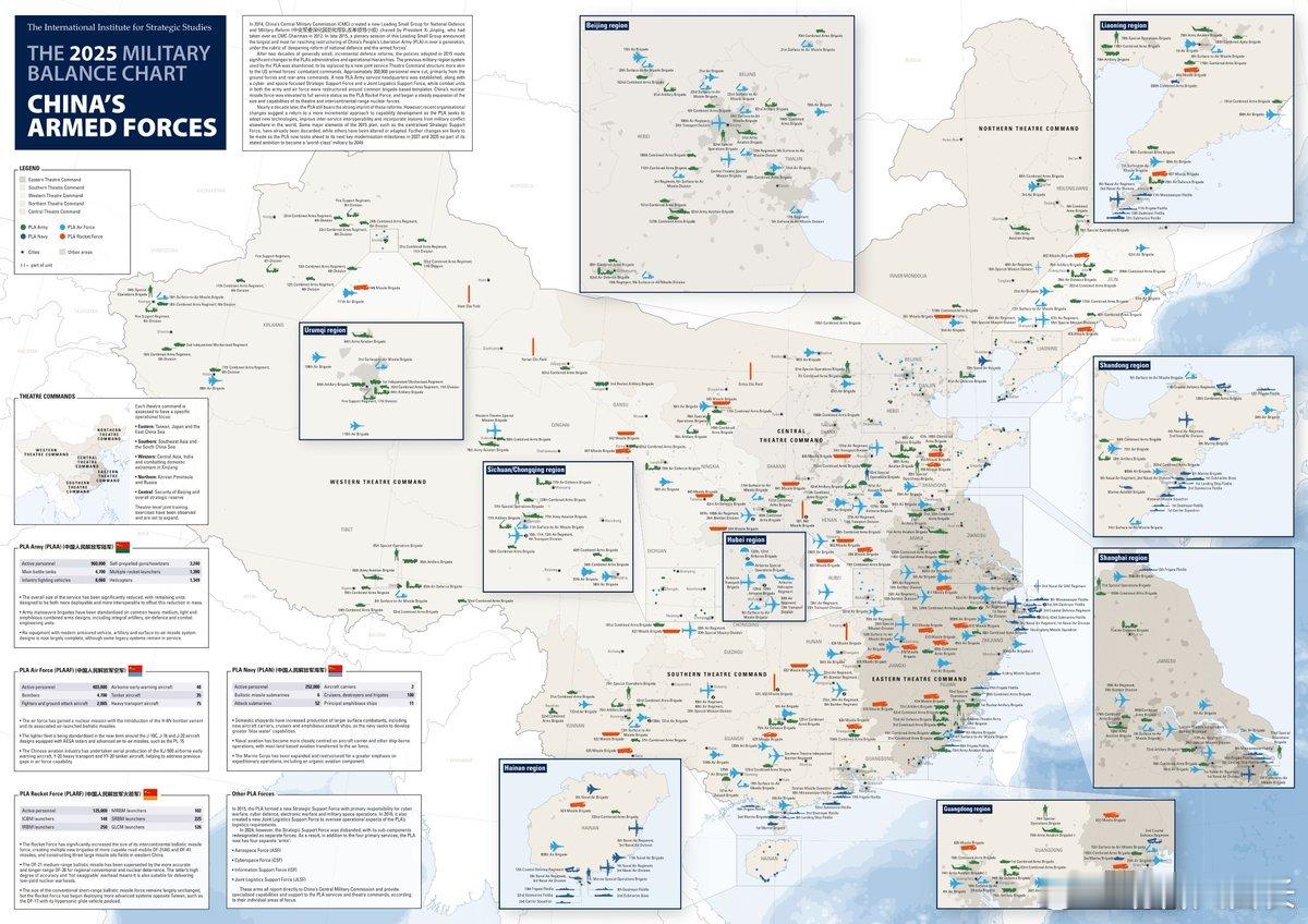 IISS(国际战略研究所) 2025 版《中国武装力量地图》读后极简笔记。1. 组织:战略支援部队(SSF)撤编,航天、网络、信息、联勤四大兵种直接由军委直辖,层级比美军更扁,反应更快。2. 战区:- 东部:合成旅+两栖+五代机,目标台海/第一岛链。- 西部:点状部署,中印高原是核心。- 南部:海南航母+核潜艇,南海=堡垒海域。3. 兵力:- 陆军缩编,但“合成旅”已成标准单元,苏式坦克洪流彻底退场。- J-20 批量入役,055 型驱逐舰井喷,攻防易位。4. 火箭军:- 哈密、玉门井群+DF-17 高超音速,核战略从“最低威慑”升级到“相互确保毁灭”,第一、二岛链介入成本指数级上升。5. 海军:- 三航母+沿海驱逐支队,蓝水骨架已现,任务从“近海防御”转为“全球护航/投送”。热点观点热点观点海外新鲜事