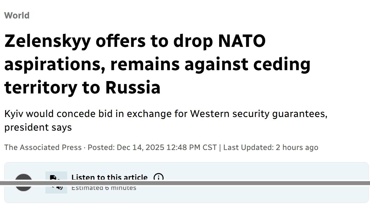 早知如今,何必当初:泽伦斯基表示乌克兰放弃加入北约 当地时间周日,乌克兰总统弗拉基米尔·泽连斯基表示,准备放弃乌克兰加入北约的申请,以换取西方的安全保障,但仍然拒绝美国提出向俄罗斯割让领土的提议,同时与美国特使就结束战争继续进行会谈。 泽连斯基与美国特使史蒂夫·维特科夫以及特朗普的女婿贾里德·库什纳进行了会谈。乌克兰领导人发布了谈判桌的照片,德国总理弗里德里希·梅尔茨坐在他旁边,面对着美国代表团。 在谈判前,泽连斯基通过WhatsApp群聊的音频片段回应记者提问,表示由于美国和一些欧洲国家拒绝了乌克兰加入北约的推动,基辅预计西方将提供与联盟成员类似的保障。 他说:“这些安全保障是防止俄罗斯新一轮侵略的机会,这已经是我们达成的妥协了。” 2022年2月,俄罗斯总统弗拉基米尔·普京将乌克兰加入联盟的请求视为对莫斯科安全的重大威胁,以此为由发动战争。克里姆林宫一直要求乌克兰放弃申请加入北约,作为任何潜在和平协议的一部分。