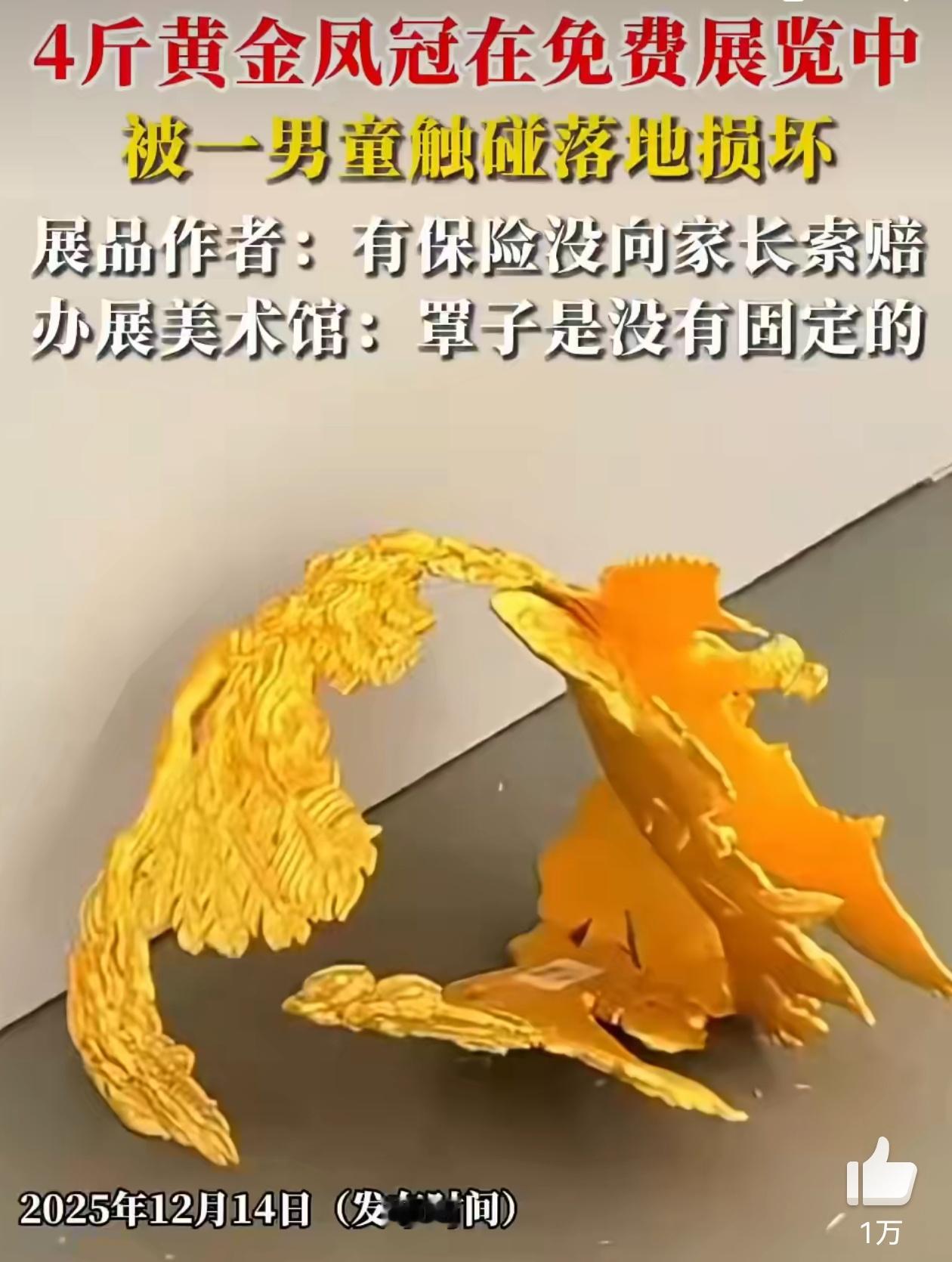美术馆回应黄金凤冠被男童触碰损坏 看了一下视频,美术馆方对展品罩子咋不固定呢?既然没固定,那起码得拉个警戒线防护一下吧,按说可是专业的。