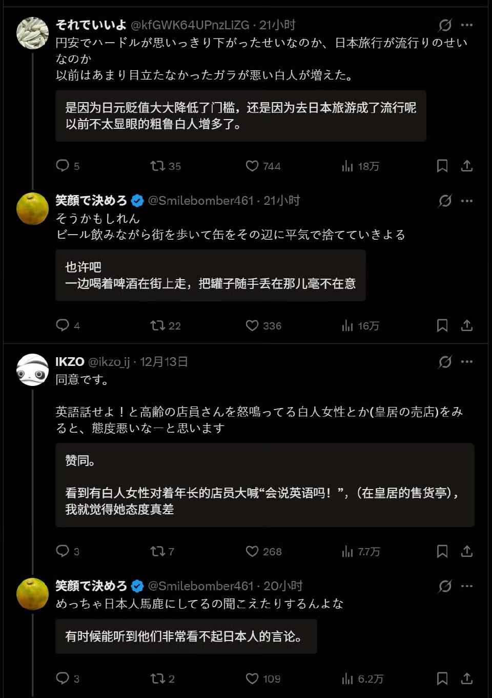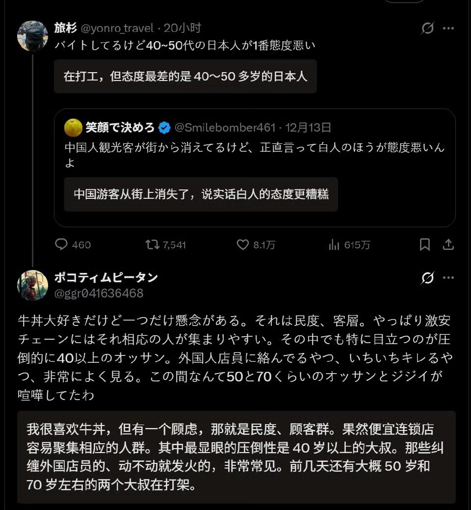 中国游客数量大幅减少后,日本网民纷纷吐槽欧美游客态度傲慢、行为扰人,深夜撞钟、当街排泄等状况屡屡发生。然而,日方在面对同类事件时,舆论反应呈现出双标态势,进而引发了关于旅游素质的争议。 目睹日本网民吐槽欧美游客素质不佳,我蓦然发觉,所谓的“素质批评”背后竟隐藏着显著的双标。同样的行为,日方对欧美游客持宽容态度,对中国游客却极为严苛。这种偏见才是最亟待纠正的,毕竟旅游素质本就不应有国籍之分。