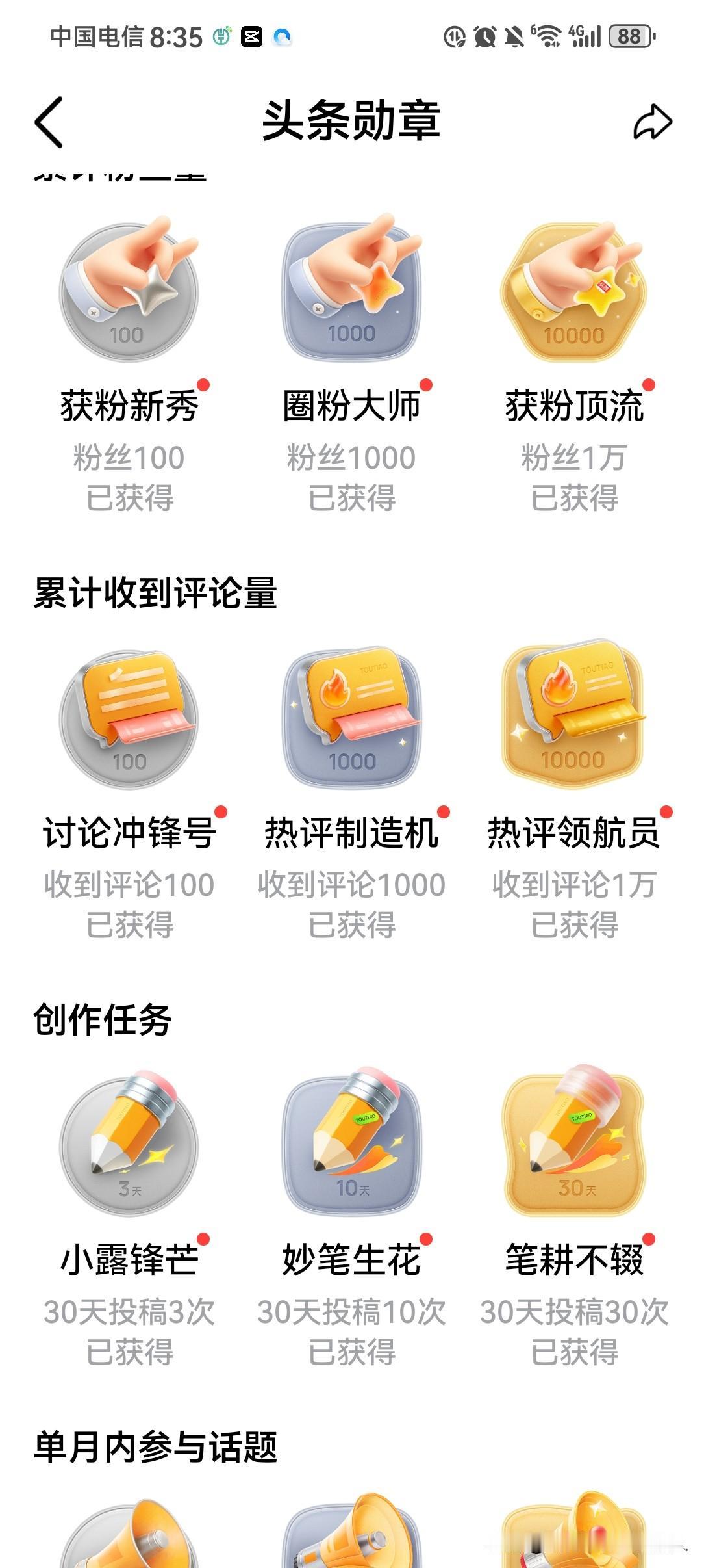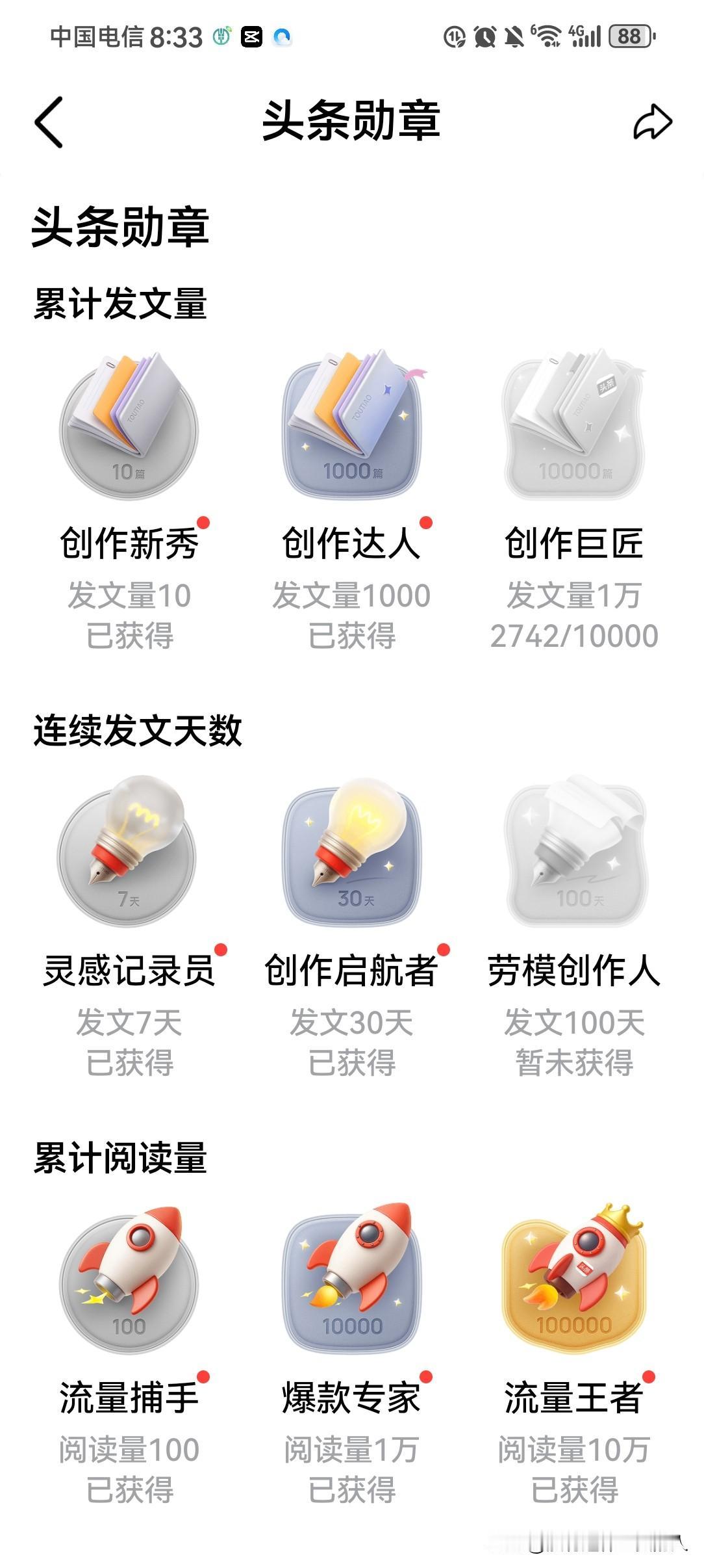 我自己都没有想到,头条居然给了我这么多的勋章。又是流量捕手,又是爆款专家,还是流量王者。 头条比我自己还了解我自己。 有没有知道的朋友,这些勋章有什么作用?感觉还像以前一样,没流量没收益。 不知道这些勋章是如何得来的。 就像小时候上学,家里的墙壁上贴满了的奖状,看上去很美,最后全部都堆积如灰。该学习学习,该考试还得考试。 中看不中用。 你们觉得是这样的吗? 荣誉头衔