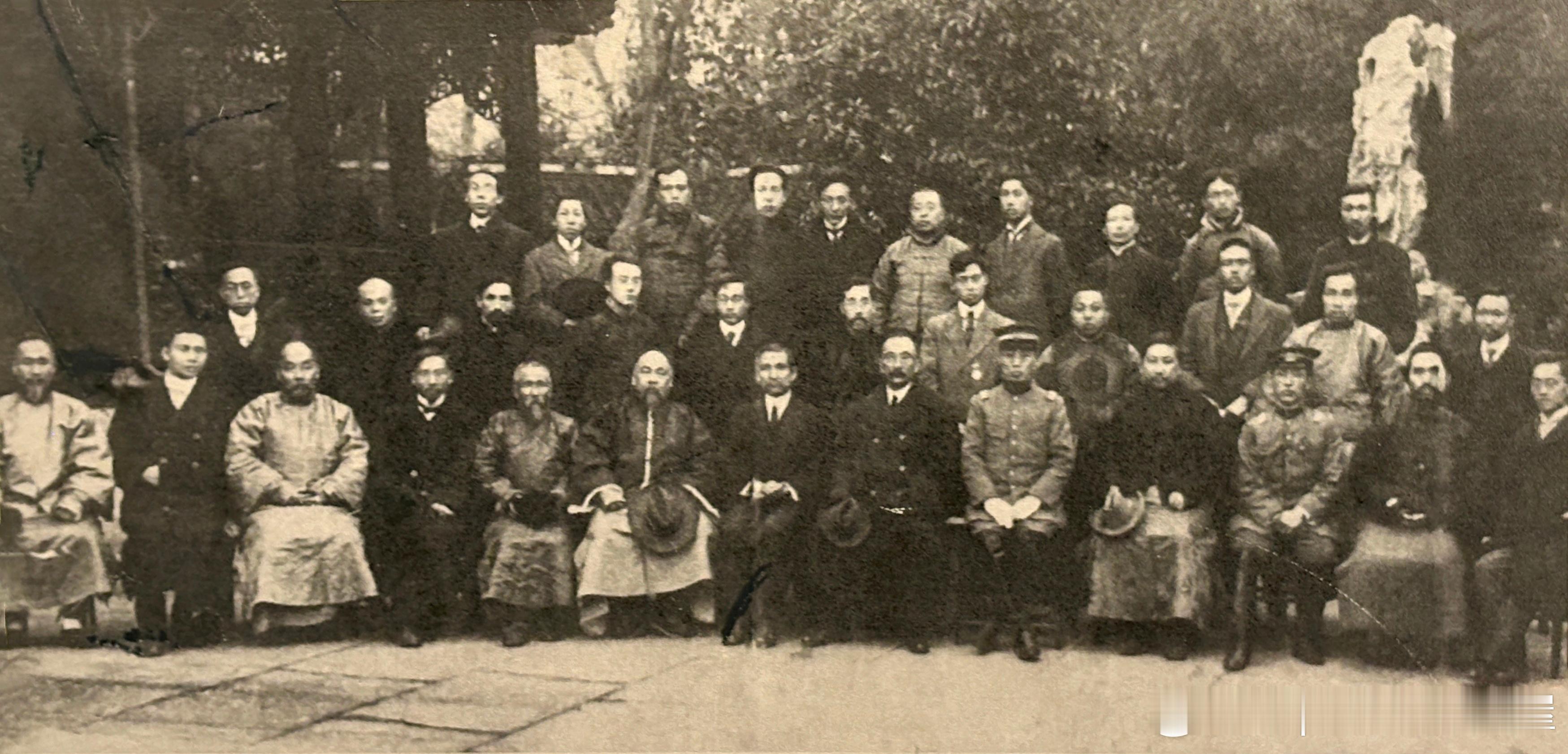 1912年4月6日孙中山在上海哈同花园出席由赵凤昌举办的欢迎会,会后与众合影。前排左起赵凤昌、汪精卫、张骞、蔡元培、谭人凤、程德全、孙中山、唐绍仪、陈其美、熊希龄、黄郛、于右任、胡汉民,后排左四张继、右五马君武历史影像