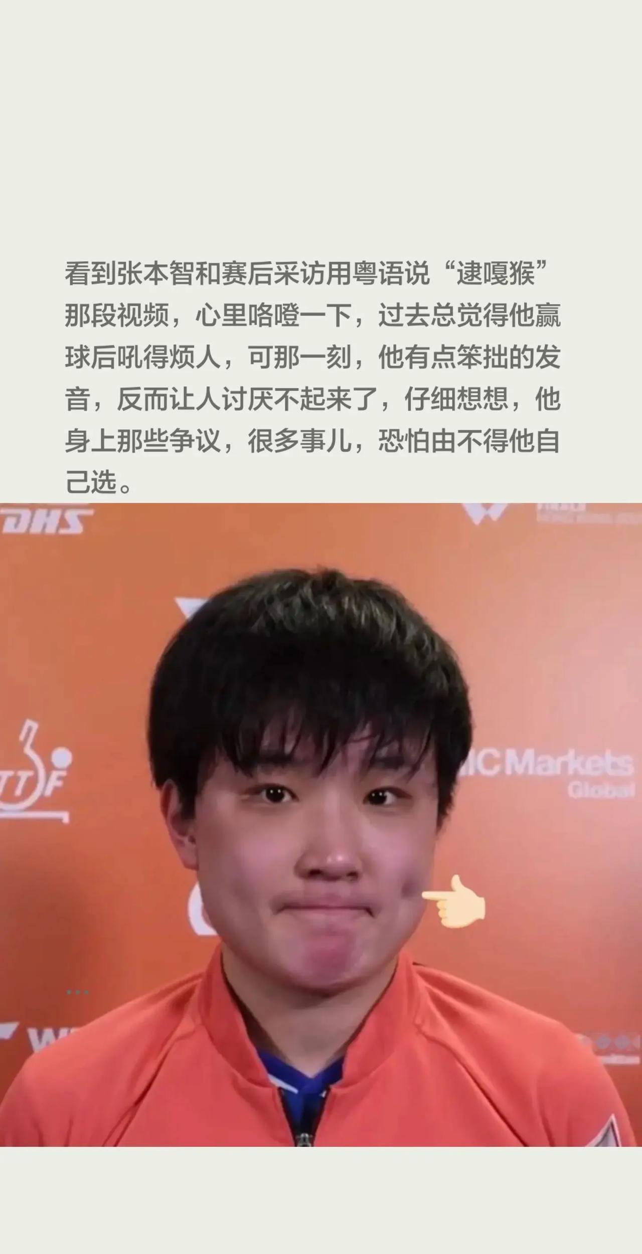 突然有点同情张本智和了,他也是身不由己。看到张本智和赛后采访用粤语说“逮嘎猴”那段视频,心里咯噔一下,过去总觉得他赢球后吼得烦人,可那一刻,他有点笨拙的发音,反而让人讨厌不起来了,仔细想想,他身上那些争议,很多事儿,恐怕由不得他自己选。国籍这事,是他最甩不掉的标签,可一个五岁孩子懂什么?当年他父母带他去日本,背后有个人选择,也有“养狼计划”的时代背景,他在日本学球、长大,为日本比赛,从职业路径看,合情合理,但我们总把体育和太多别的东西绑在一起,把他的输赢都上纲上线,这种情绪,很多时候跟他本人关系不大。那他为什么不留在国内? 这个问题其实有点何不食肉糜,国内乒乓的竞争有多激烈,水有多深,大家心里都有数,强如樊振东,处境尚且不易,一个没背景的苗子,想打出来太难了,出走,是为了获得比赛的机会,是为了能站在球台前实现自己的价值,这只是一个运动员对职业生涯最基本的负责,别扯太远。所以,抛开这些,看球场上的他,必须承认,这小子在进步,以前靠吼,现在靠战术,靠“多变发球和反手提速”这些真本事,总决赛五次进决赛,前三次都拿亚军,这次能拼下来夺冠,说明心理和技术都磨出来了,输了那么多次都没垮,这种韧性本身就该被尊重,他模仿樊振东的庆祝动作,直言想再跟偶像交手,这种对强者的纯粹态度,比很多虚头巴脑的话实在。观众的反应很说明问题,成都的嘘声,香港的欢呼,对比鲜明,香港观众给他投应援大屏,他赛后认真签名,这是基于比赛和拼搏的双向奔赴,那句“逮嘎猴”之所以打动人,就是因为它简单、直接,是一种放下身段的沟通尝试,体育能不能纯粹一点?看香港观众的反应,答案是能的。国内有些声音,确实容不下一个单纯打球的人,动不动就扯到别的层面,把比赛搞得无比复杂,看看人家卢森堡的倪夏莲,六十岁了还在享受乒乓球本身,我们的环境,有时候给这项运动附加了太多不必要的重量。说到底,张本智和就像一面镜子,照出对手的不足,逼着国乒继续前进;也照出我们自身一些不够开阔的心态,那句“逮嘎猴”让我们看到,褪去所有标签,他也就是个想打好球、并努力用自己方式表达感谢的年轻人。体育的魅力,终究应该回到体育本身,为拼搏喝彩,为进步鼓掌,这比纠结于其他东西,重要得多。