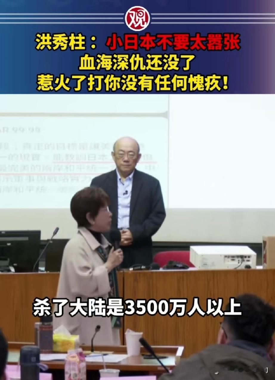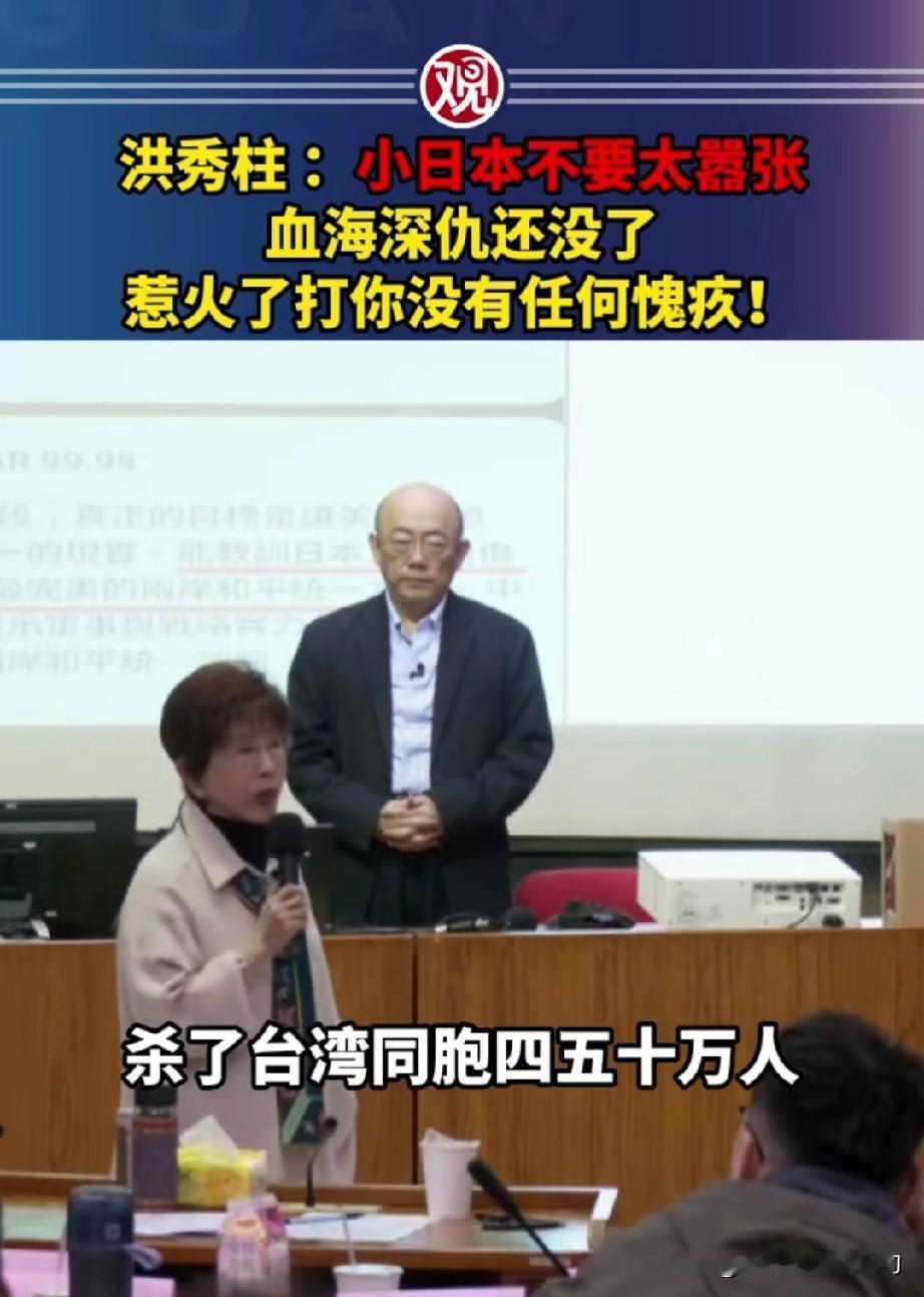 13日这天,洪秀柱火力全开,怒斥“小日本莫嚣张,血海深仇未了结”,更是直言“中国被惹火了打日本没有任何愧疚之心”!这话字字铿锵,句句戳中民族痛处,这份敢亮立场、不饶历史的硬气,既是对侵略者的严正警告,更是对民族记忆的铮铮守护! 她痛批,小日本别太狂,当年侵华,3500万大陆同胞丧命,连台湾都有四五十万人遇难,这笔血海深仇,怎么可能一笔勾销? 再看整个岛内,2300万人里边,就只有她这一位弱女子敢大声疾呼。郭正亮在它身后来回踱步,最终啥也没说。蓝白绿三大党装聋作哑,一众名嘴只顾着追更政坛乱斗的狗血戏码,没一个敢吭声! 这一声声怒吼,不光吼出了咱中国人的骨气,更狠狠抽了那些忘了历史、装聋作哑的政客一大嘴巴子!