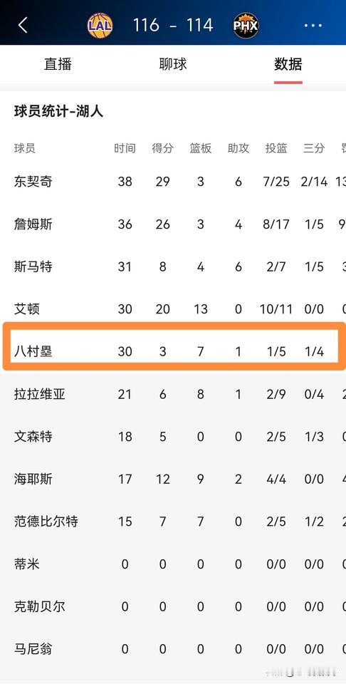 我强烈建议湖人管理层立刻交易走八村垒!在今天湖人客场以116:114击败太阳的比赛中,八村垒的表现简直就是一场灾难。全场比赛下来,八村垒首发出战30分钟,投篮5中1,其中三分球4中1仅仅得到可怜的3分,他的场上正负值为-12。 毫不客气的说,八村垒是湖人上场球员中表现最糟糕的球员,他的糟糕表现险些导致球队输掉了比赛。