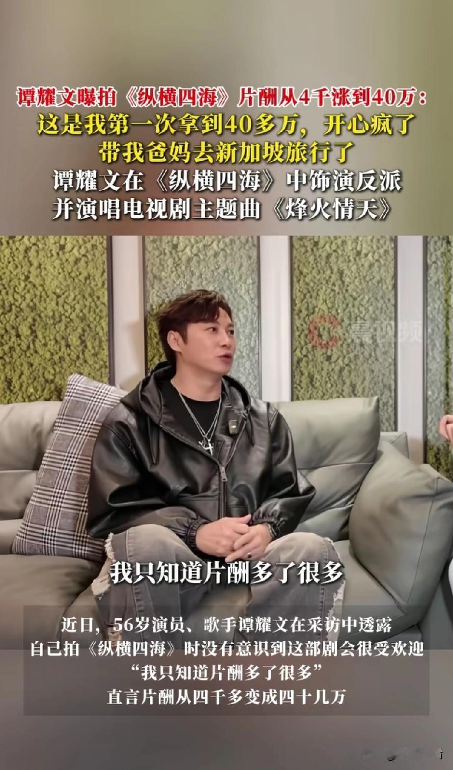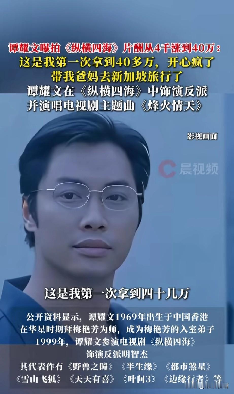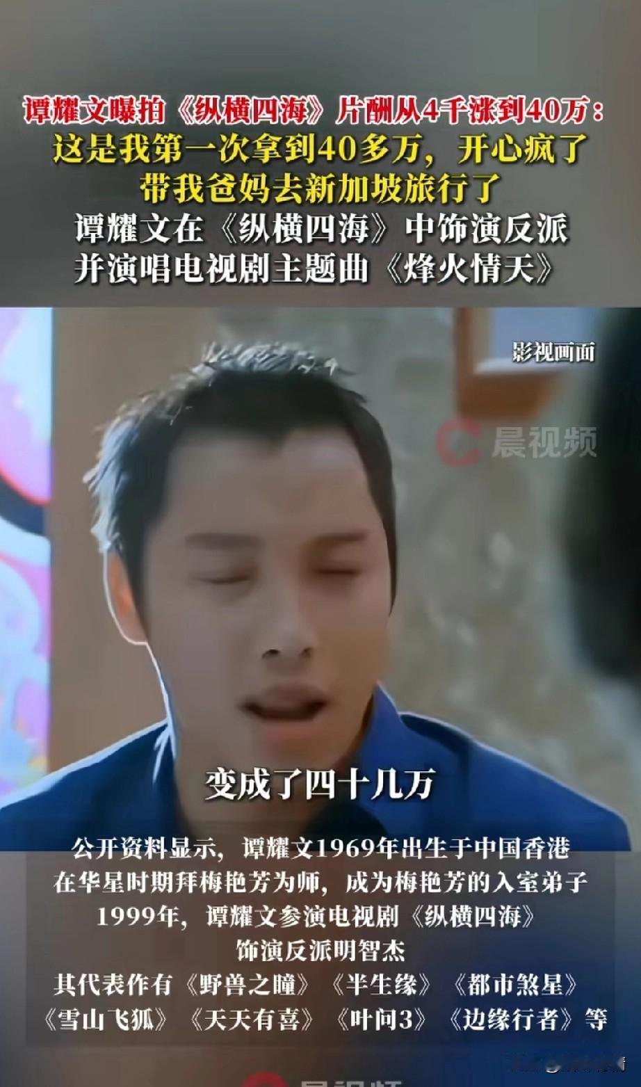 谭耀文是大家熟悉的一个演员, 他在做节目时谈论到, 自己当时演纵横四海的时候, 片酬从4000涨到了40万, 这是他第一次拿到40万的片酬, 当时可把他高兴坏了, 拍完戏后就带着父母去新加坡旅游, 当时的他还不知道这部剧这么火, 如今已经56岁, 因为长得非常帅, 就算年龄大了也很有味道, 后来也演了非常多的电影,电视剧, 但是只有这部剧中的反派让他大火, 怪不得现在的人都想当演员, 原来是好挣钱, 如今娱乐圈的星二代,星三代的, 牢牢控制住了演艺资源, 这就是为什么现在的电影,电视剧质量差,短剧就是一个破局的关键, 大家看过谭耀文演的纵横四海吗? 娱乐圈那点儿事 扒一扒娱乐圈 谭耀文演唱会 谭联耀出场费