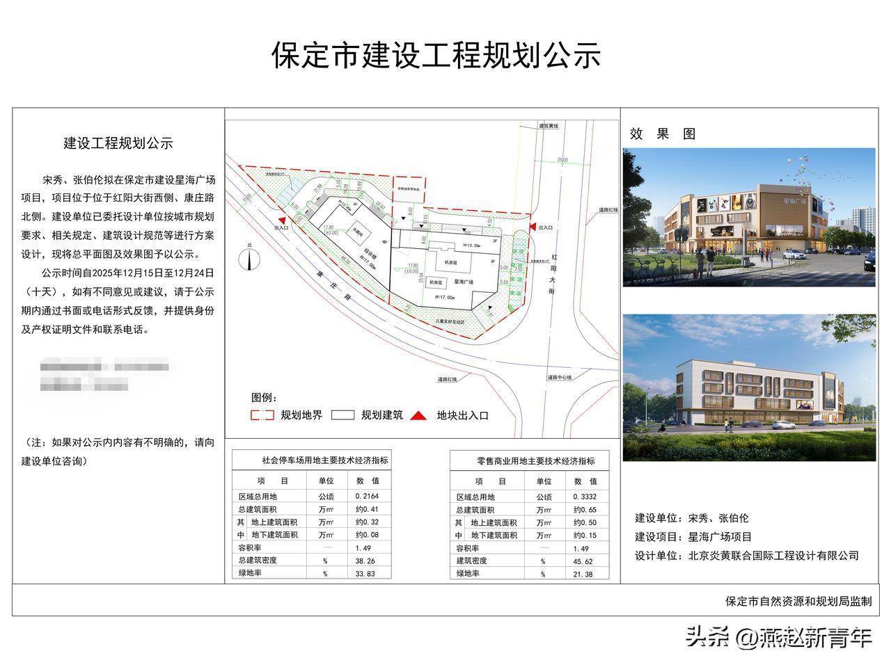 约8.24亩!保定这里要建一座星海广场!宋秀、张伯伦拟在保定市建设星海广场项目,项目位于位于红阳大街西侧、康庄路北侧。建设单位已委托设计单位按城市规划要求、相关规定、建筑设计规范等进行方案设计,现将总平面图及效果图予以公示。 公示时间自2025年12月15日 至12月24日(十天)