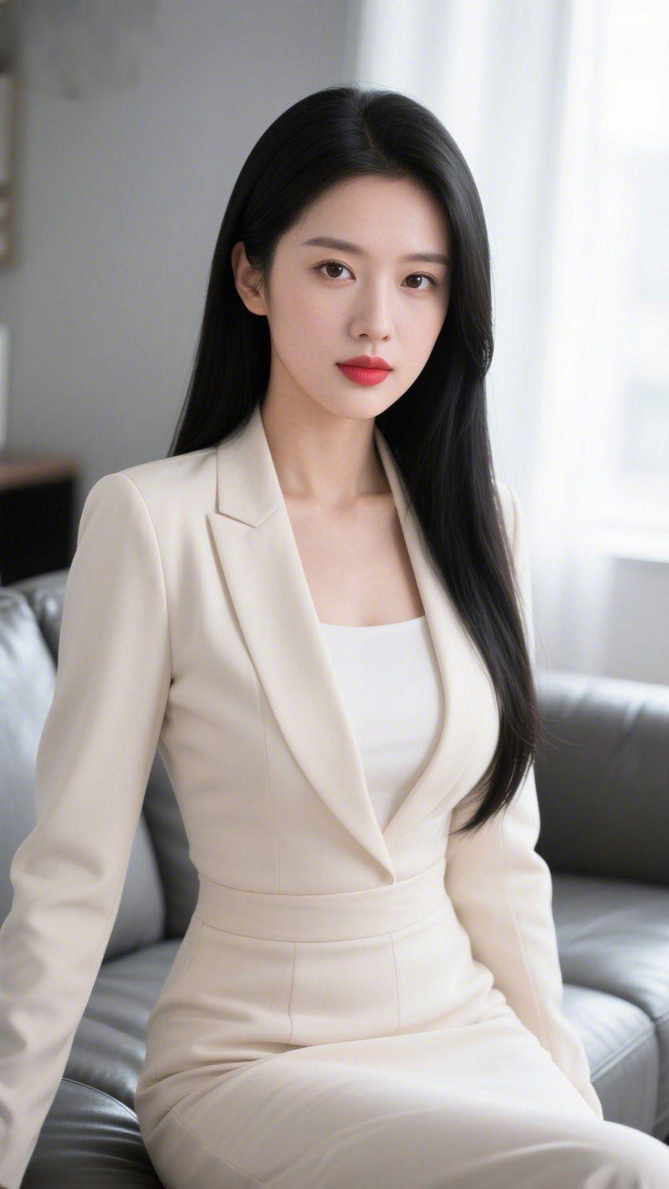 柔光里的舒展意 浅米色西装衬着舒展的肩线,长发垂落肩侧,发梢轻扫衣料的弧度,将温柔揉进室内的柔光里。 她静坐在沙发旁,领口线条轻缓,唇间的红是冷调空间里的一抹暖——并非张扬的艳,是浸了从容的柔。窗外的光漫过纱帘,落于肩臂之上,连空气都漾开松弛的质地。 我们常念及“职场的凌厉”,却忽略了这般时刻:妥帖的衣装裹着舒展的状态,冷与暖都恰好平衡。此刻,房间似一盏温软的灯,她安坐其中,是生活里刚好松弛的那缕从容。 舒展氛围感 日常松弛感