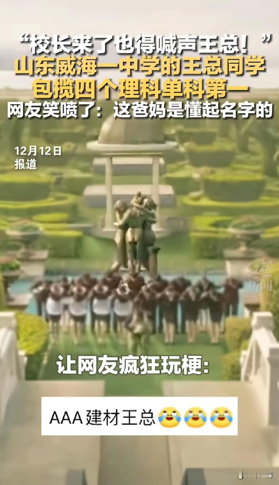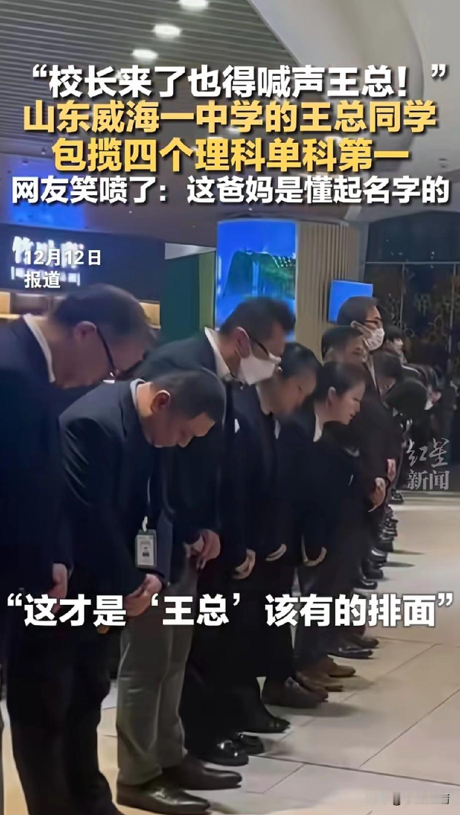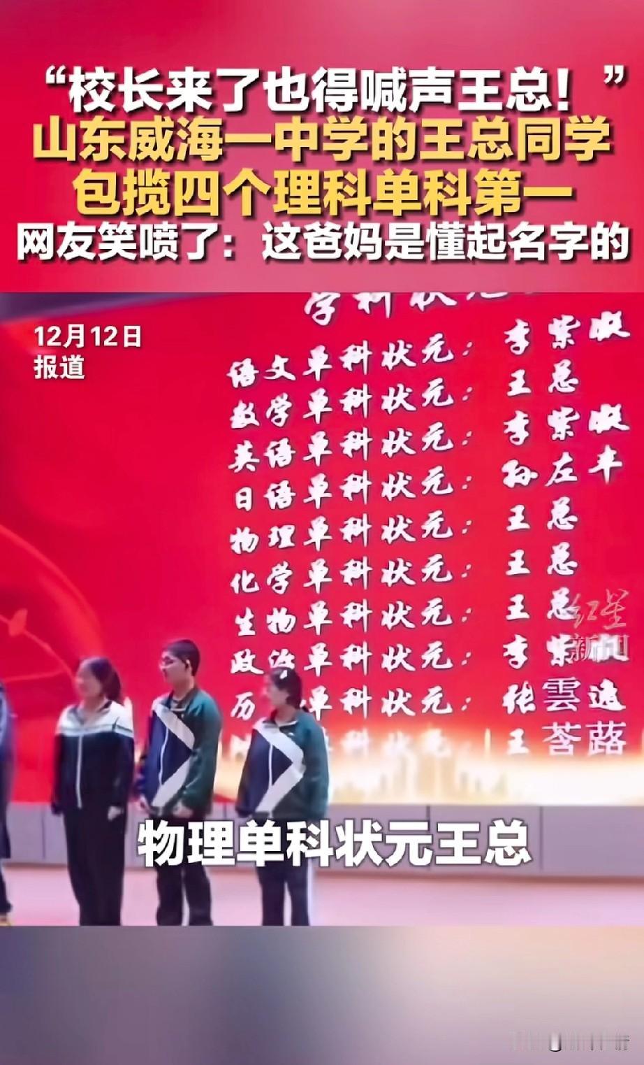 山东威海一中学王总火了, 因为这个王总是个学生, 还是个学霸, 一次考试直接包揽了四科第一名, 上台领奖的时候, 不停的在喊王总, 台下的同学都笑疯了, 连校长来了也得喊王总, 这是王总最大的排面, 大家都知道老总都是企业家, 所以王总可能将来也是老总, 只不过提前就这么出名了, 网友纷纷玩梗, 还是王总的父母会取名字, 以后这孩子不当老总都对不起父母, 大家对于学校王总怎么看? 搞笑王总 王总该有的样子 宁波王总 超威王总 威海英语提分王 高一单科王 王总传奇
