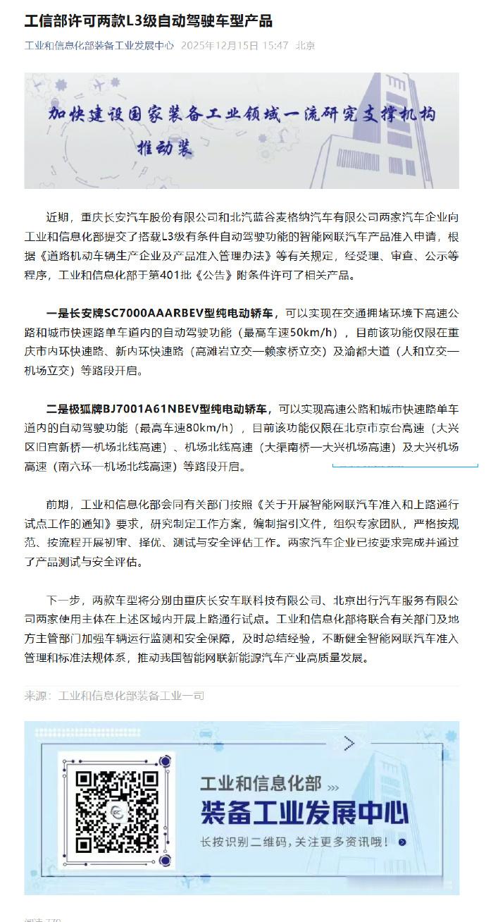 工信部许可2款L3级自动驾驶车型 12月15日,据工业和信息化部装备工业发展中心发布:近期,重庆长安汽车股份有限公司和北汽蓝谷麦格纳汽车有限公司两家汽车企业向工业和信息化部提交了搭载L3级有条件自动驾驶功能的智能网联汽车产品准入申请,根据《道路机动车辆生产企业及产品准入管理办法》等有关规定,经受理、审查、公示等程序,工业和信息化部于第401批《公告》附条件许可了相关产品。一是长安牌SC7000AAARBEV型纯电动轿车,可以实现在交通拥堵环境下高速公路和城市快速路单车道内的自动驾驶功能(最高车速50km/h),目前该功能仅限在重庆市内环快速路、新内环快速路(高滩岩立交—赖家桥立交)及渝都大道(人和立交—机场立交)等路段开启。二是极狐牌BJ7001A61NBEV型纯电动轿车,可以实现高速公路和城市快速路单车道内的自动驾驶功能(最高车速80km/h),目前该功能仅限在北京市京台高速(大兴区旧宫新桥—机场北线高速)、机场北线高速(大渠南桥—大兴机场高速)及大兴机场高速(南六环—机场北线高速)等路段开启。前期,工业和信息化部会同有关部门按照《关于开展智能网联汽车准入和上路通行试点工作的通知》要求,研究制定工作方案,编制指引文件,组织专家团队,严格按规范、按流程开展初审、择优、测试与安全评估工作。两家汽车企业已按要求完成并通过了产品测试与安全评估。下一步,两款车型将分别由重庆长安车联科技有限公司、北京出行汽车服务有限公司两家使用主体在上述区域内开展上路通行试点。工业和信息化部将联合有关部门及地方主管部门加强车辆运行监测和安全保障,及时总结经验,不断健全智能网联汽车准入管理和标准法规体系,推动我国智能网联新能源汽车产业高质量发展。