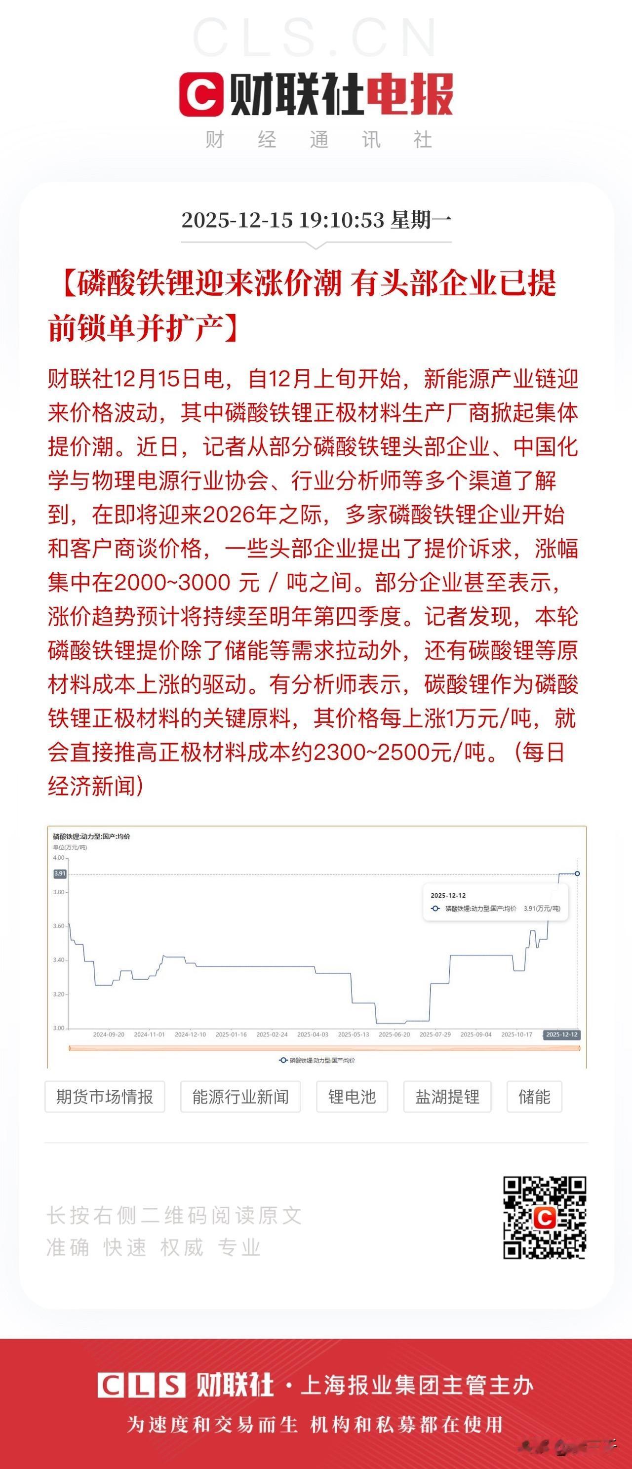 磷酸铁锂涨价潮盘后继续吹风! 涨价大头还是落在磷酸铁锂正极材料, 分析师认为碳酸锂价格每上涨1万元/吨, 就会直接推高正极材料成本约2300-2500元/吨 大厂如宁德时代提前签订长协锁单, 天华新能、龙蟠科技、容百科技, 先后都公布了一系列长期供货协议。 协议版本不用看, 大多和工程行业材料调价标准一样。 … 当下锂电池更应该关注出海方向, 随着欧美市场新能源汽车渗透率提升, 欧洲9国渗透率破30%、 美国市场渗透率突破10%后快速向20%迈进。 华友钴业、当升科技、国轩高科、万润新能、中伟股份、湖南裕能等纷纷在摩洛哥、西班牙、东南亚以及美国本土市场有磷酸铁锂产能布局。 这些产能有望快速得到充分利用, 项目开始实现正收益! 它们的叙事逻辑强过国内饱和市场。 …