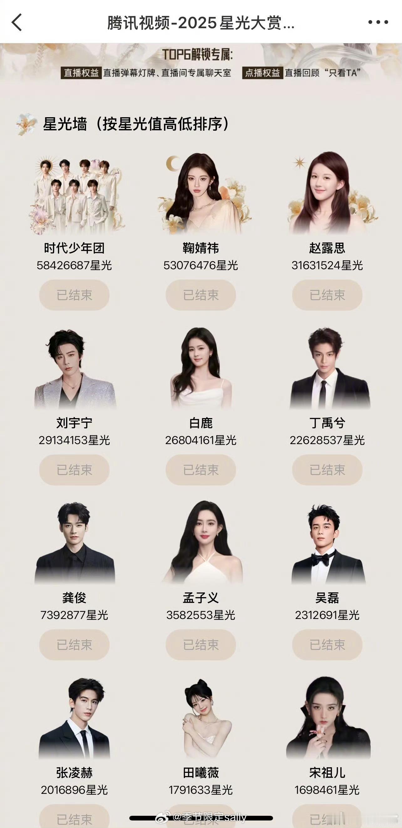 星光大赏星光墙投票终于结束了!最终前六名:时代少年团、鞠婧祎、赵露思、刘宇宁、白