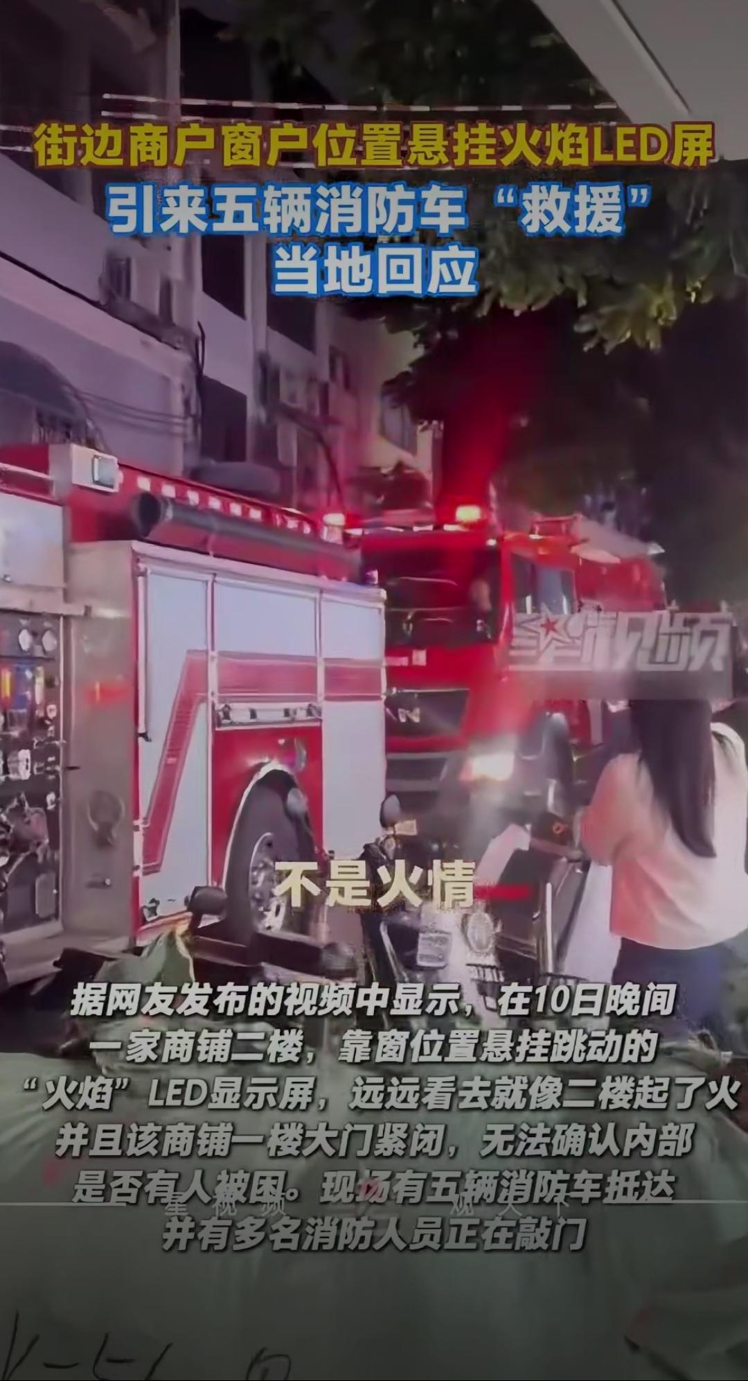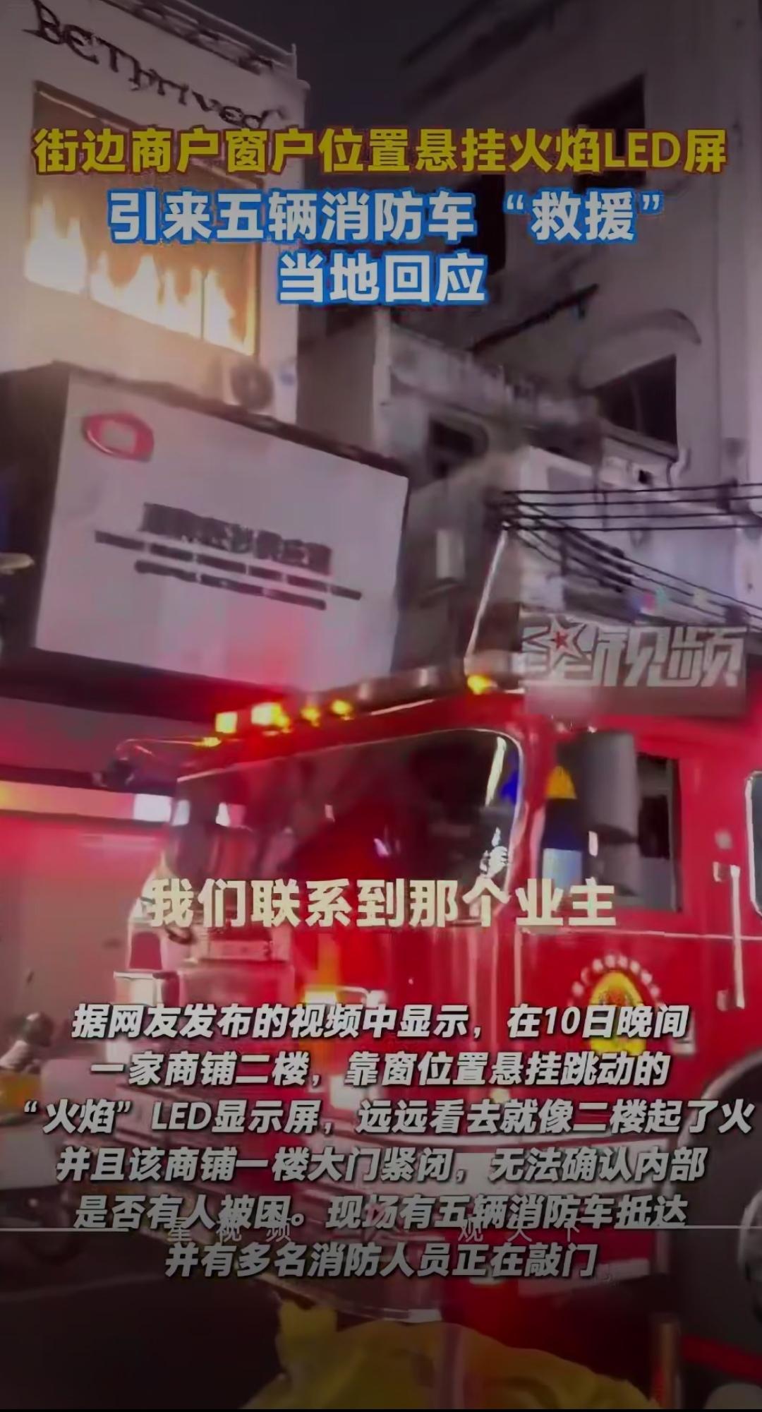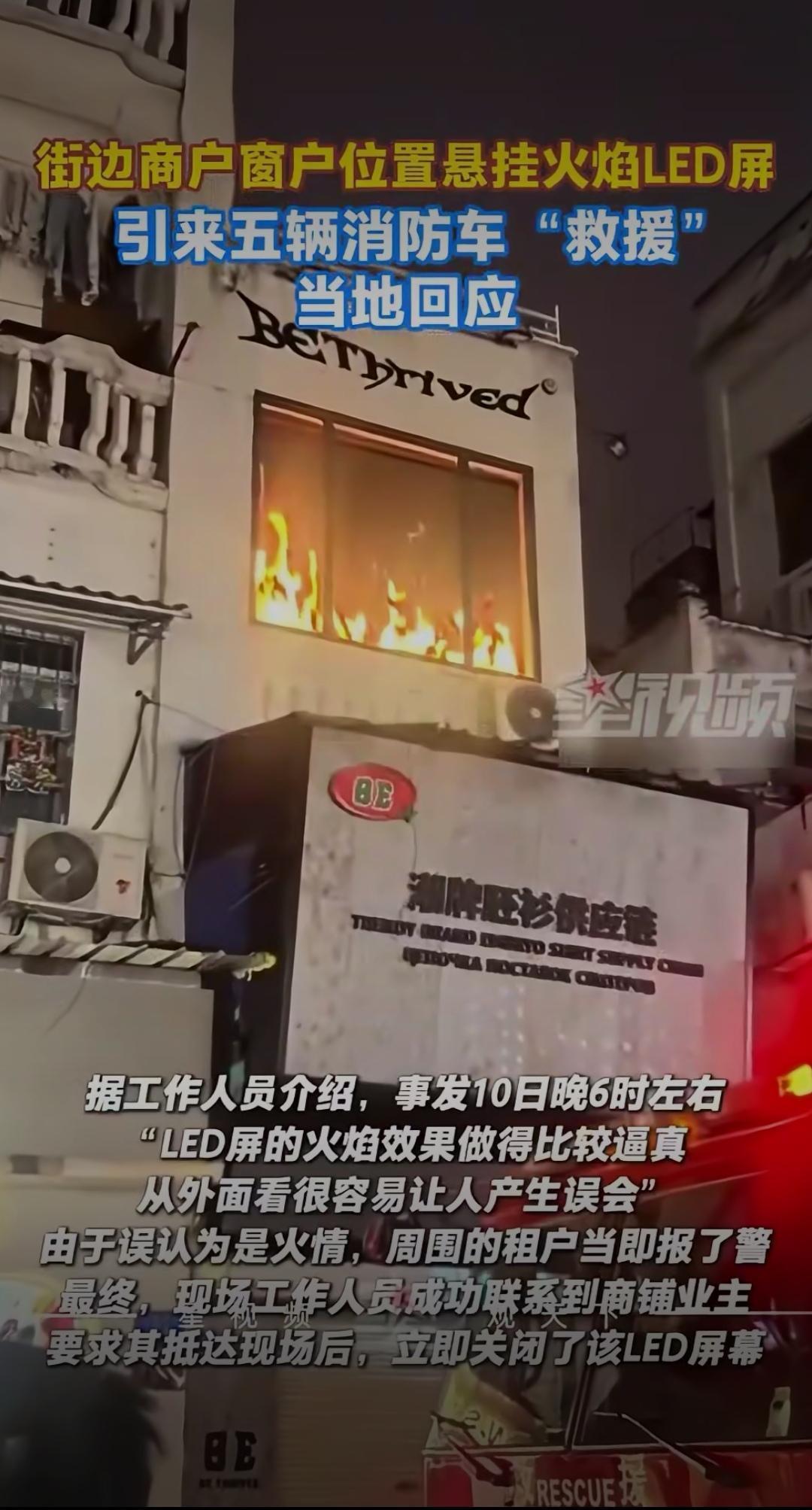 街边LED屏“火焰”逼真引消防车驰援:一场乌龙背后藏着暖心与反思 火焰灯光效果 街边商户窗户位置悬挂火焰LED屏,引来五辆消防车“救援”,当地迅速回应。据工作人员介绍,事发10日晚6时左右,“LED屏的火焰效果做得比较逼真,从外面看很容易让人产生误会”。由于误认为是火情,周围的租户当即报了警,最终,现场工作人员成功联系到商铺业主,要求其抵达现场后,立即关闭了该LED屏幕。 夜幕刚降临,眼看着临街商铺的窗户里“火光冲天”,滚滚“热浪”仿佛要冲破玻璃,路过的租户心都揪紧了,二话不说掏出手机报警。不过几分钟,五辆消防车呼啸而至,消防员们迅速下车、铺设水带、准备破门,一系列操作干脆利落,看得周围路人连连点赞。 可当消防员敲开商铺大门,眼前的一幕却让所有人哭笑不得——哪有什么熊熊烈火,只有一块正循环播放火焰特效的LED屏,光影交错间,竟把逼真感拉满,难怪会闹出这么大的乌龙。 这场虚惊一场的救援,没有造成任何损失,却戳中了无数人的柔软内心。有网友调侃“这LED屏厂家该给商户颁奖”,更有人感慨“幸好报警人警惕性高,消防员反应快”。 细想之下,这场乌龙何尝不是一面镜子?它照见了市民们的安全意识,更照见了消防队伍的责任担当。当然,也给商家提了个醒:创意营销可以有,但不能逾越公共安全的底线,别让酷炫的特效,变成惊扰人心的“隐患”。 毕竟,消防车的每一次出动,都关乎着真正的生死时速。你怎么看待商家这种创意营销?欢迎在评论区聊聊你的看法!