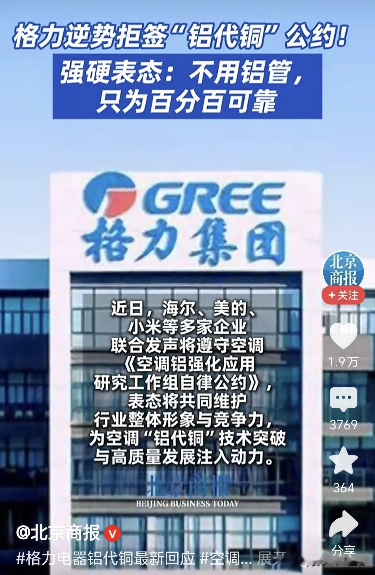 如果是真的,那格力就活该独享市场! 最近,海尔、美的、小米等多家企业联合发声,表示将遵守空调《空调铝强化应用研究工作组自律公约》,推动空调“铝代铜”技术发展。但格力却逆势而为,强硬表态不用铝管,只为保证产品百分百可靠。 其实,空调用铝管代替铜管,成本是降低了,可质量风险却大了。铝管容易随机穿孔漏冷液,维修起来麻烦得很。要是格力坚持用铜管,那它可能就独享注重质量的市场了。就像网友说的,就算格力空调贵点,很多人也愿意买,毕竟能用得安心,不用整天担心空调漏液出故障。 空调铝代铜