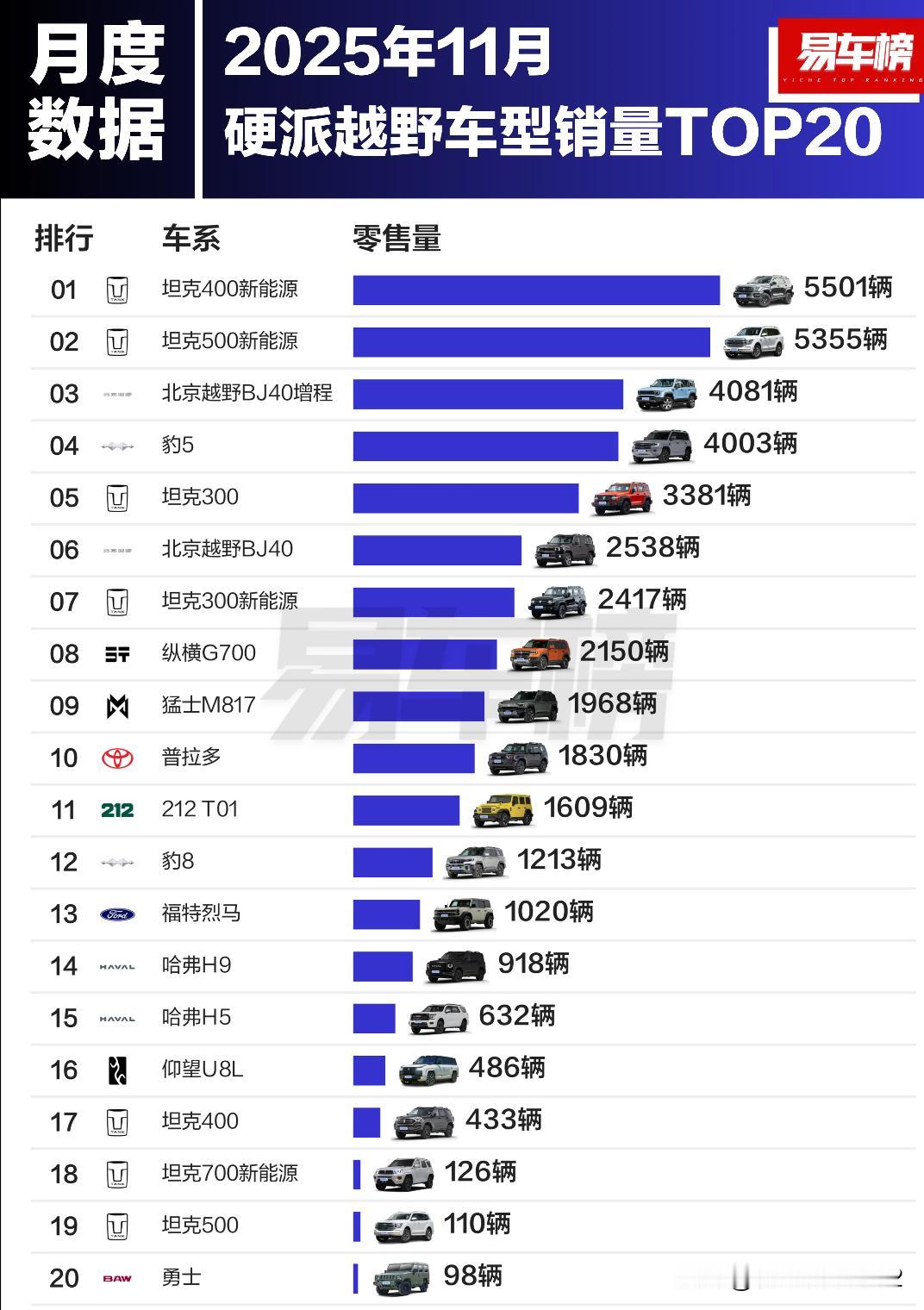 2025年11月方盒子&硬派越野车型销量TOP20 根据易车整理的乘联分会零售数据显示: 方盒子车型销量前3名分别为:钛7、哈弗大狗、钛3;零售销量分别为:24019辆、16252辆、6054辆 硬派越野车型销量前3名分别为:坦克400新能源、坦克500新能源、北京越野BJ40增程;零售销量分别为:5501辆、5355辆、4081辆
