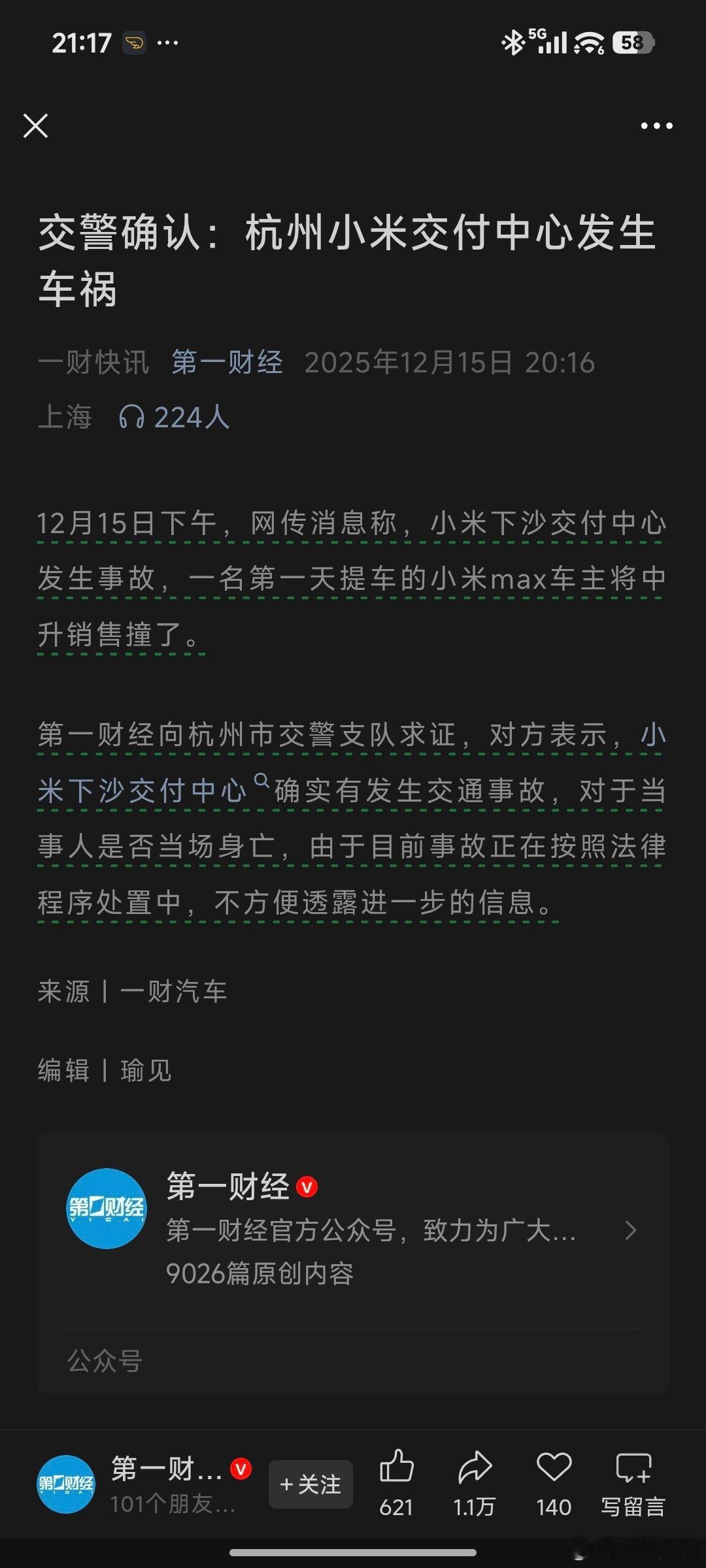 希望人最终没事啊🙏🏻基本上群里好多人都是聊第一财经的这图,感觉第一财经对于小米汽车的报道还是挺快