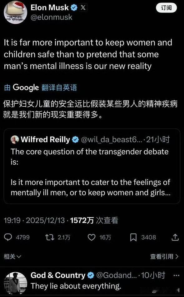 马斯克: 保护妇女儿童的安全远比假装某些男人的精神疾病就是我们新的现实重要得多。