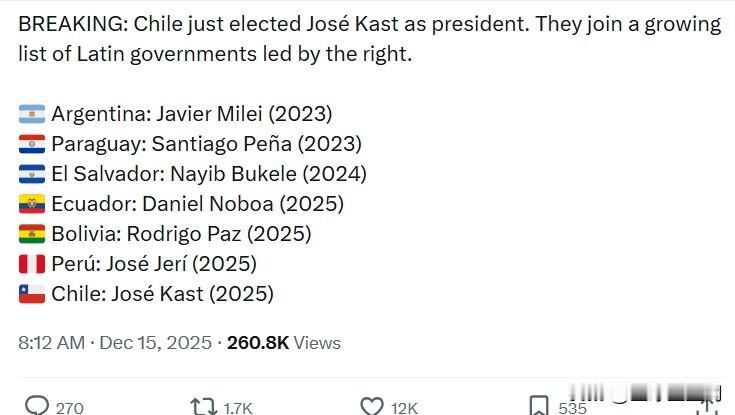 智利刚刚选举何塞·卡斯特为总统,加入了由右派领导的拉美国家不断扩大的行列: 阿根廷:哈维尔·米莱伊(2023) 巴拉圭:圣地亚哥·培尼亚(2023) 萨尔瓦多:纳伊布·布克尔(2024) 厄瓜多尔:丹尼尔·诺沃亚(2025) 玻利维亚:罗德里戈·帕斯(2025) 秘鲁:何塞·赫里(2025) 智利:何塞·卡斯特(2025)