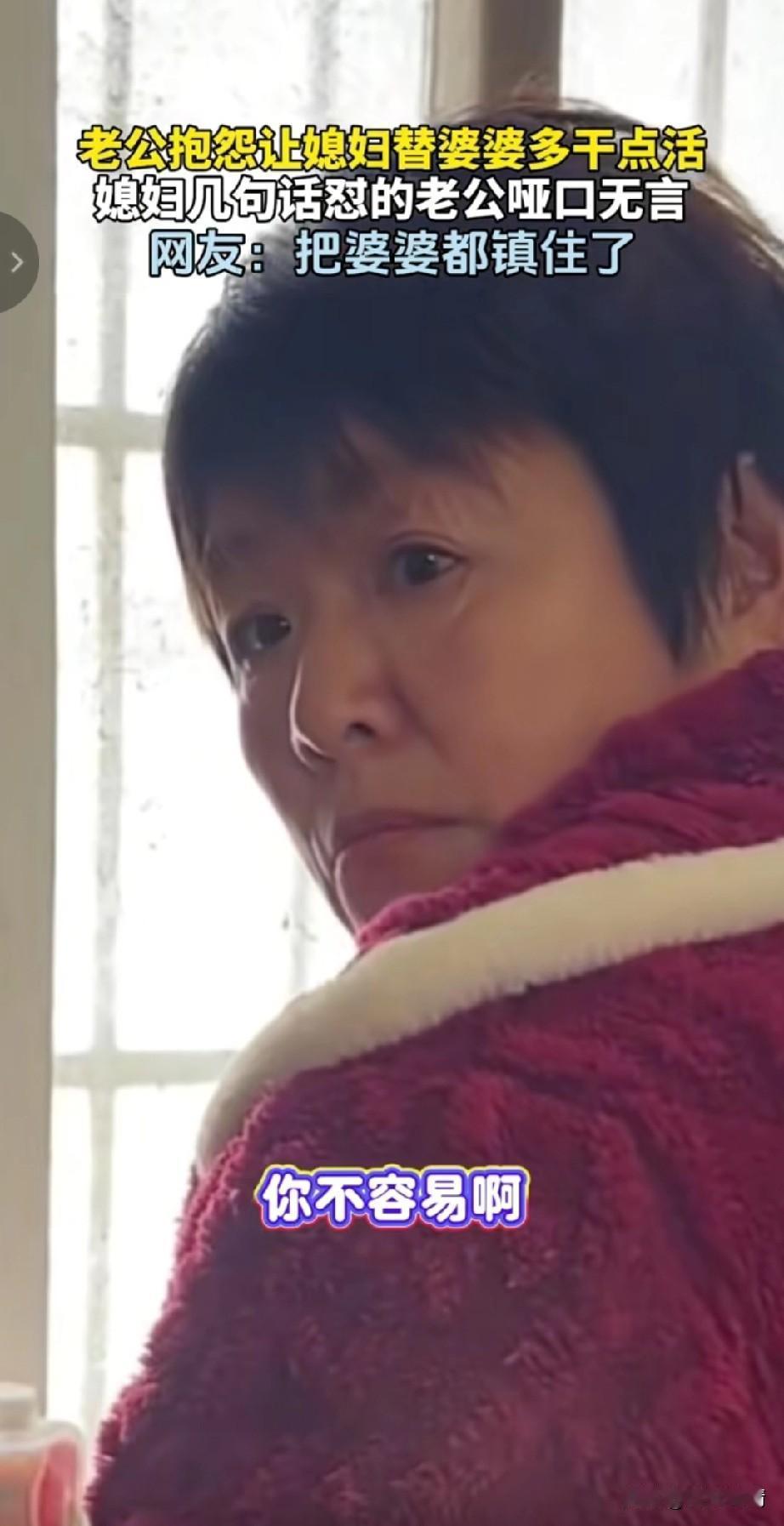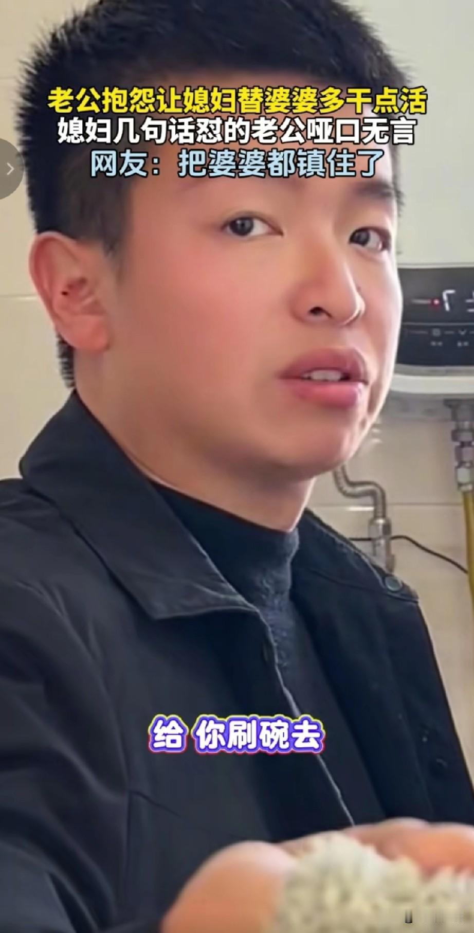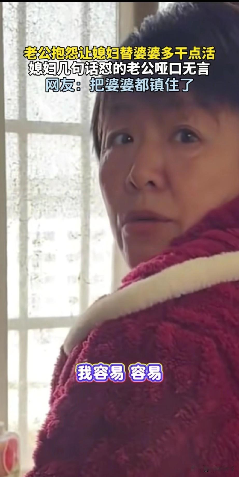 老公抱怨媳妇儿, 让媳妇儿替他妈干点活, 就教育媳妇儿说自己妈妈养活自己不容易,说着就把钢丝球递给了媳妇儿, 让媳妇儿给他妈刷碗去, 没想到这媳妇儿也是真虎, 表示你妈不容易就拉我下水, 少给我来拉帮结派的那一套, 你妈不容易是我嫁过来后不容易吗? 生的是你,养的是你, 他的不容易是你和你爸的不作为造成的,跟我有毛线关系? 结婚之前你在那儿呼呼睡大觉, 妈妈给你洗衣做饭的时候, 你没有发现她不容易, 你在那儿打游戏的时候, 也没有发现你妈妈不容易, 这话一出直接把老公怼懵了, 不过这儿媳还没有说完, 你娶了媳妇儿发现你妈不容易了, 你妈的不容易让我一个人兜着呗 婆婆在那里大气也不敢喘一下, 女子发泄完之后, 要问自己的婆婆,你容易吗? 婆婆无奈表示容易容易! 现在的儿媳妇都上天了, 嫁过来不见不干活, 还要指挥自己的婆婆干活, 婆婆做的不好了, 好的媳妇儿不会当面说, 没有素质的儿媳妇直接当面就开怼了, 这样的儿媳妇娶来何用? 大家对于这样的儿媳妇儿怎么看? 婆媳关系 婆媳那些事儿 婚姻与家庭 对老公抱怨