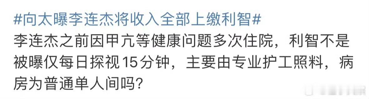 啊?这是谁看到了?而且医院有些特殊病房或者是特殊情况的就是有规定时间啊,不过我看前段时间状态还是挺好的!!有些人这么斤斤计较不能趴人家病房门口数吧?向太还爆李连杰将自己收入全部上交利智?啊这到底都是可以说的吗?感觉向太知道很多诶