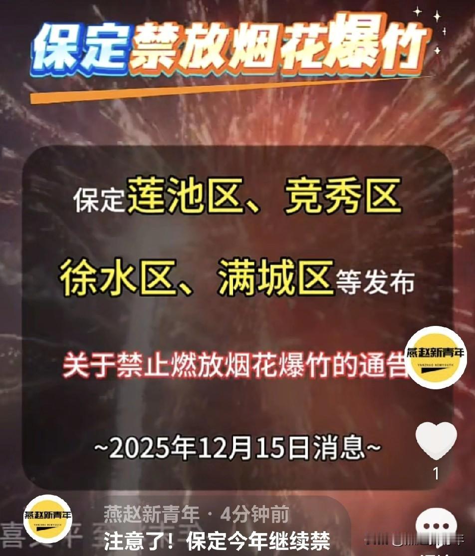 注意了!保定今年继续禁放烟花爆竹!?莲池区、竞秀区、徐水区、满城区等多地已发禁止燃放通知了,大家相互提醒吧!一年一度的春节又要到来了,对于很多人,烟花爆竹象征着年味儿,那么近保定是否让让呢?保定2025年是否继续禁止烟花爆竹,按照之前2020年的管理规定,说是规定是有效期五年,到今年底正好到期了,很多人等待解封,今年2026年春节是不是可以放了?可就在刚刚,多区县已发通知,继续禁放烟花爆竹!多地已发通知!