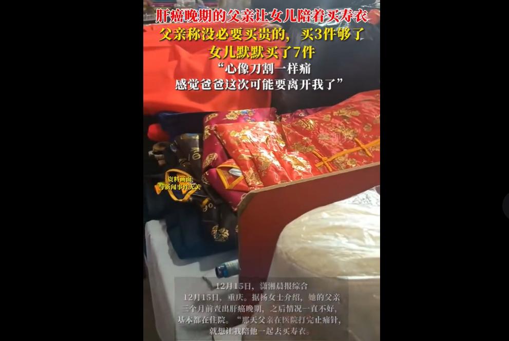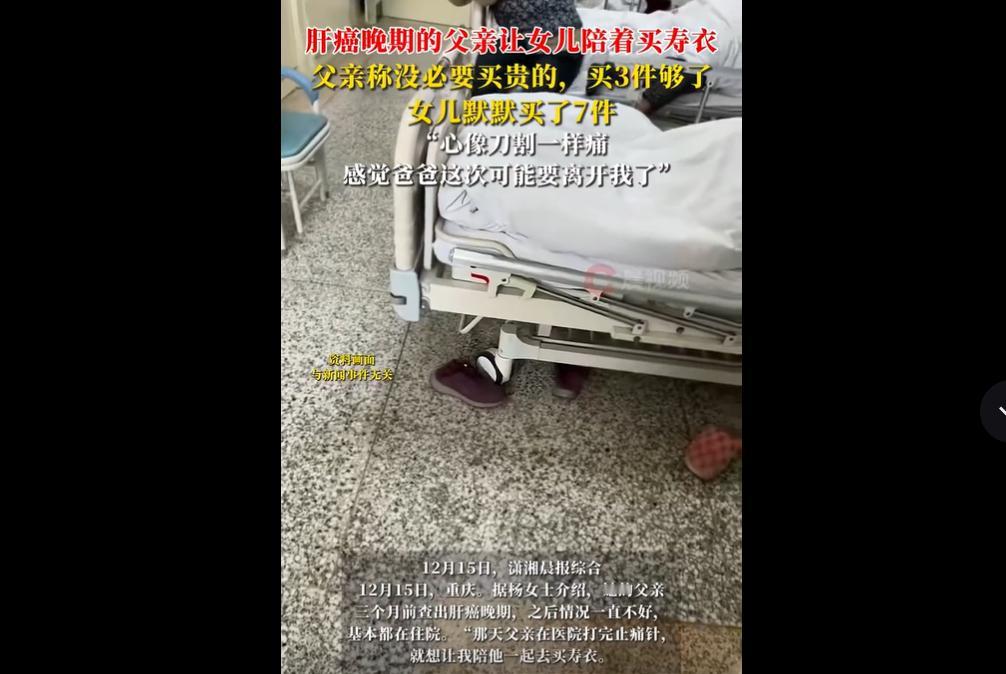12 月 15 日重庆,杨女士的父亲三个月前查出肝癌晚期,常住院治疗。 某天父亲打完止痛针,提出让杨女士陪自己买寿衣,还说不用买贵的,三件就够,杨女士默默买了 7 件。 路上父亲聊起身后安葬地,杨女士虽早有心理准备,仍心如刀割,预感父亲可能将离世。 几件寿衣藏着双向的疼。 父亲怕花钱说 “只要三件”,是不想给女儿添负担;女儿默默买 7 件,是想让父亲走得体面。 这一来一回的体谅,比千言万语更戳心 —— 病重时的父母总想着 “少麻烦孩子”,子女却想 “多为父母做点”,这份双向奔赴的爱,藏着最朴实的亲情重量。 父女俩人聊聊身后事也是种温柔。 很多人忌讳和亲人谈死亡,可杨女士父亲主动提寿衣、说安葬地,不是悲观,是不想让女儿措手不及。 这种坦诚,其实是把最后的安心留给家人,也让子女有机会陪他完成 “告别仪式”,比突然离世的遗憾,多了份彼此陪伴的温暖。 陪伴是最好的 “止痛药”。 父亲打止痛针仍撑着去买寿衣,杨女士全程默默配合,没说 “别想这些”,而是尊重父亲的意愿。 比起说 “会好起来的” 空话,这种 “你需要,我就陪” 的行动,才是病重亲人最需要的安慰 —— 有时候,陪伴比药物更能缓解心里的疼。 陪伴父母走完最后一程,这是每个子女的 “必修课”。 看着父母从能照顾我们,到需要我们陪买寿衣,谁心里不发酸? 可正是这些瞬间,让我们明白 “长大” 就是接过父母的担子,陪他们走完最后一程。 杨女士的经历,也提醒我们:趁父母还在,多些耐心陪伴,别等失去才追悔。女儿陪肝癌父亲买寿衣 心像被刀割