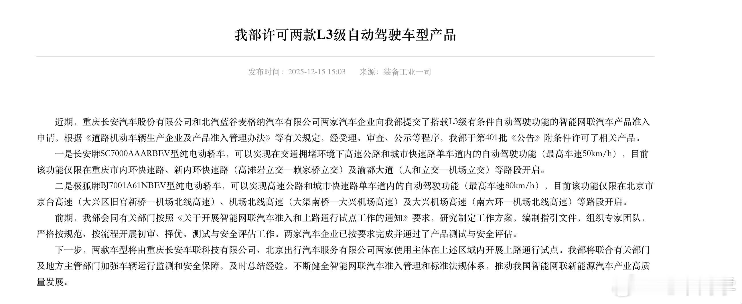 这两年的辅助驾驶发展有种什么感觉呢?是百花齐放……像一群天才在旷野上赛跑,但各自认准一个方向狂奔。比如技术路线非常多样,从纯视觉派到激光雷达融合派,各种解决方案涌现……其次商业模式也是广泛在试错,比如车企自研、科技公司赋能、跨界联合、硬件预埋+软件订阅……最后包括各类概念也是层出不穷,辅助驾驶、智能驾驶、高阶智驾等等等等但旷野虽热闹充满可能,也难免伴随尘土飞扬。说点装逼的话,物理学有个概念叫做熵增,指一个孤立系统中,如果没有外部能量介入,事物总会自发地从有序走向无序。把过去几年的辅助驾驶产业看作一个系统,那么它就正在经历着典型的熵增过程。区别是它并非在混乱发展,而是技术为进化积累、探索而必要经历的过程。今天工信部的许可,感觉就像有人来到旷野,非常具体地铺了两条起跑线。一条重庆、一条北京,白纸黑字,从这里开始,跑到这里为止,规则如此。意味着天才赛跑的阶段快结束了,现代竞技体育的规则、量级和裁判,开始入场了。也许明年这样的标准跑道会多起来。最终胜出的不一定是旷野上跑得最飘的那个,但也许是在规则内把车开得最稳、最准的那个。晚上静下心来想了一下这个事情,即我国首批l3自动驾驶车型获准入许可 觉得很有意思,于是扯一点浅薄的见解和各位老师探讨。大v聊车