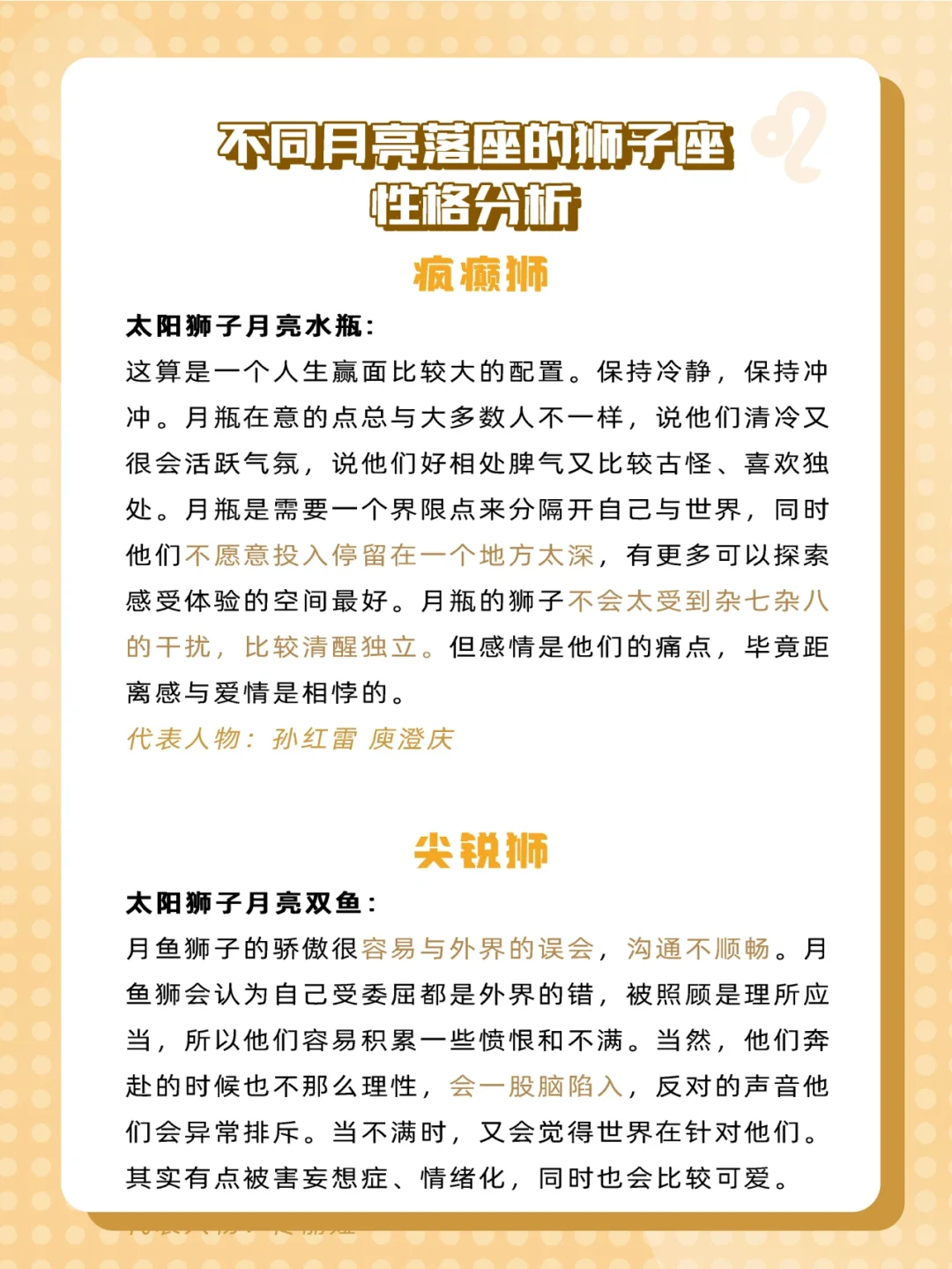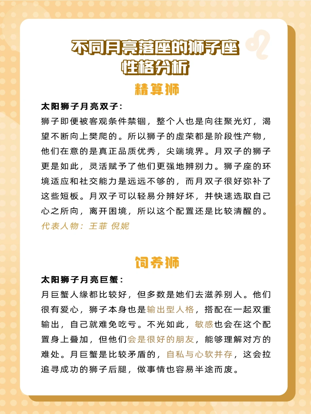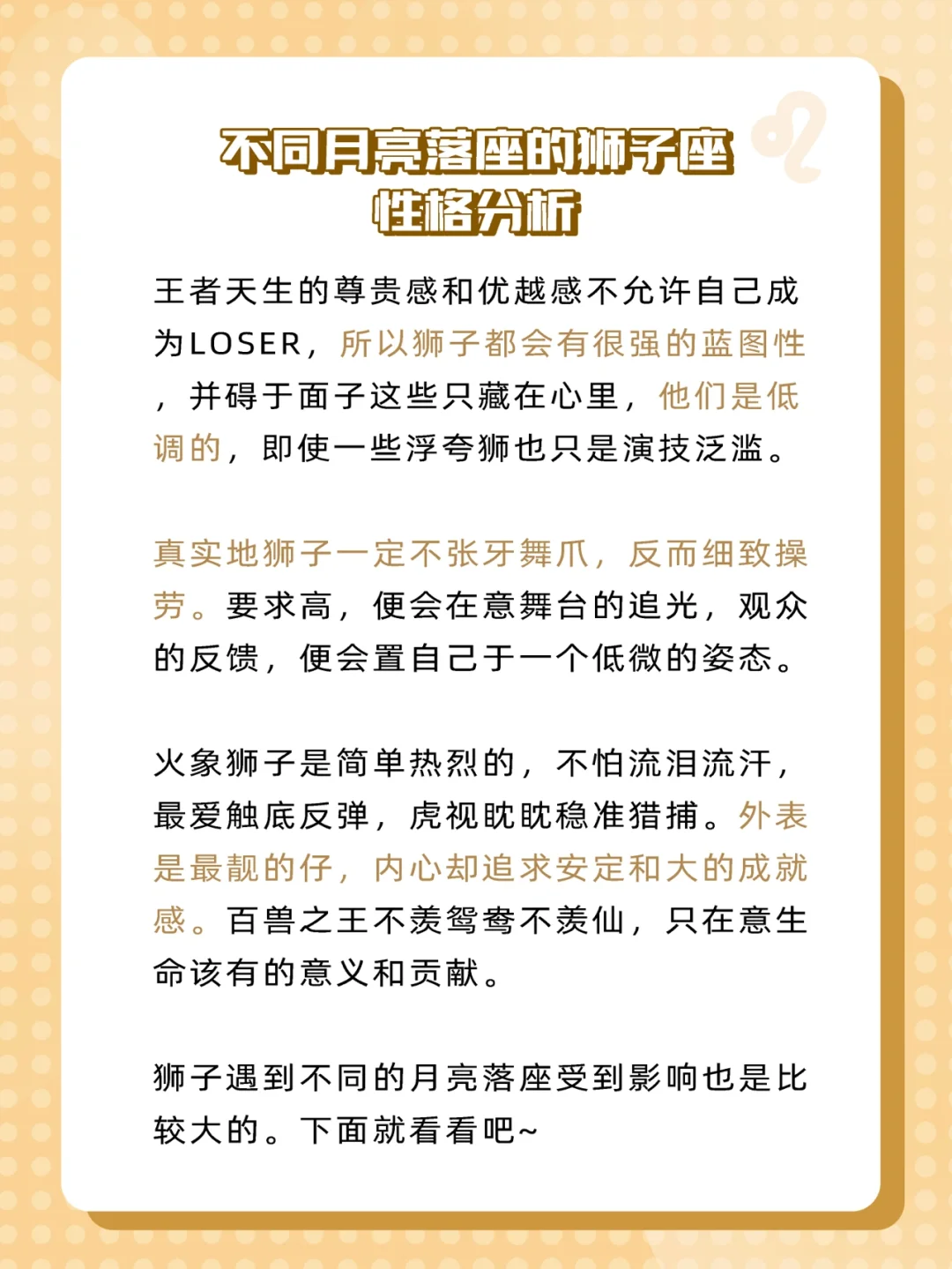 有很多宝宝们说有些星座特征不太像自己,那就有可能是因为星盘里其他星座配置的影响哟!所以今天给大家来科普一下不同月亮星座的狮子座是什么样✨