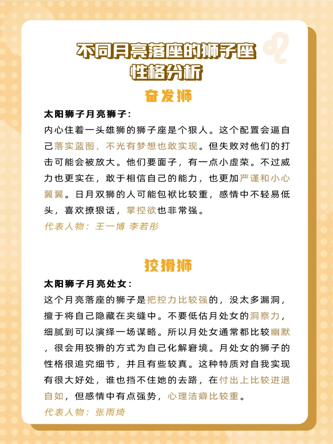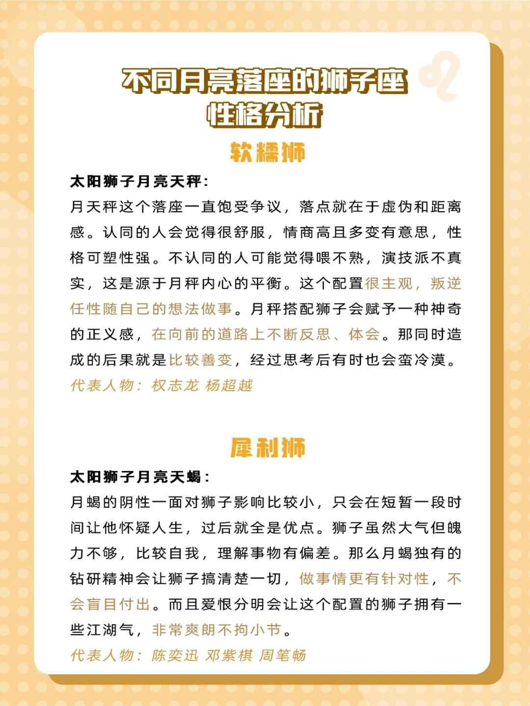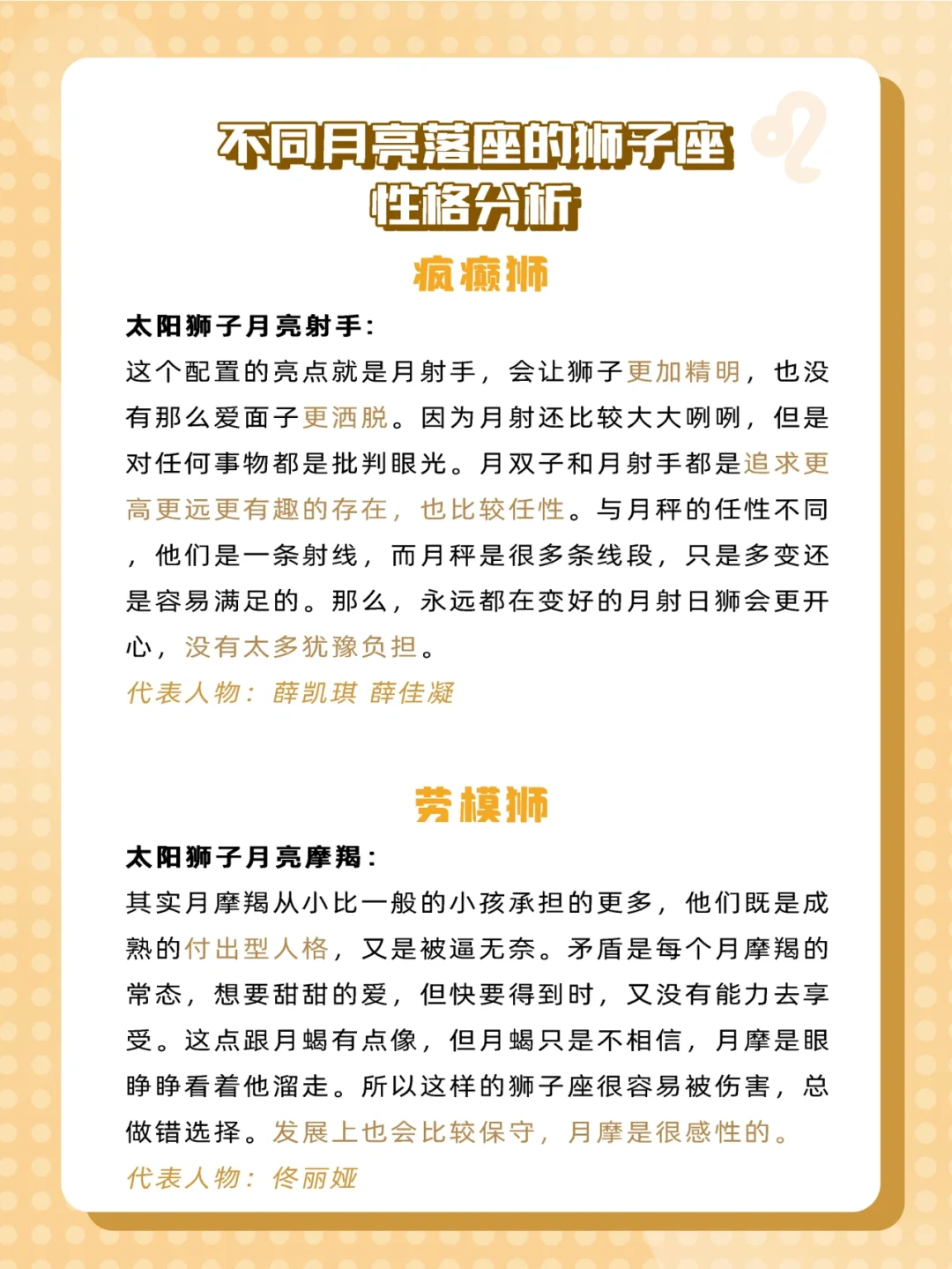 有很多宝宝们说有些星座特征不太像自己,那就有可能是因为星盘里其他星座配置的影响哟!所以今天给大家来科普一下不同月亮星座的狮子座是什么样✨
