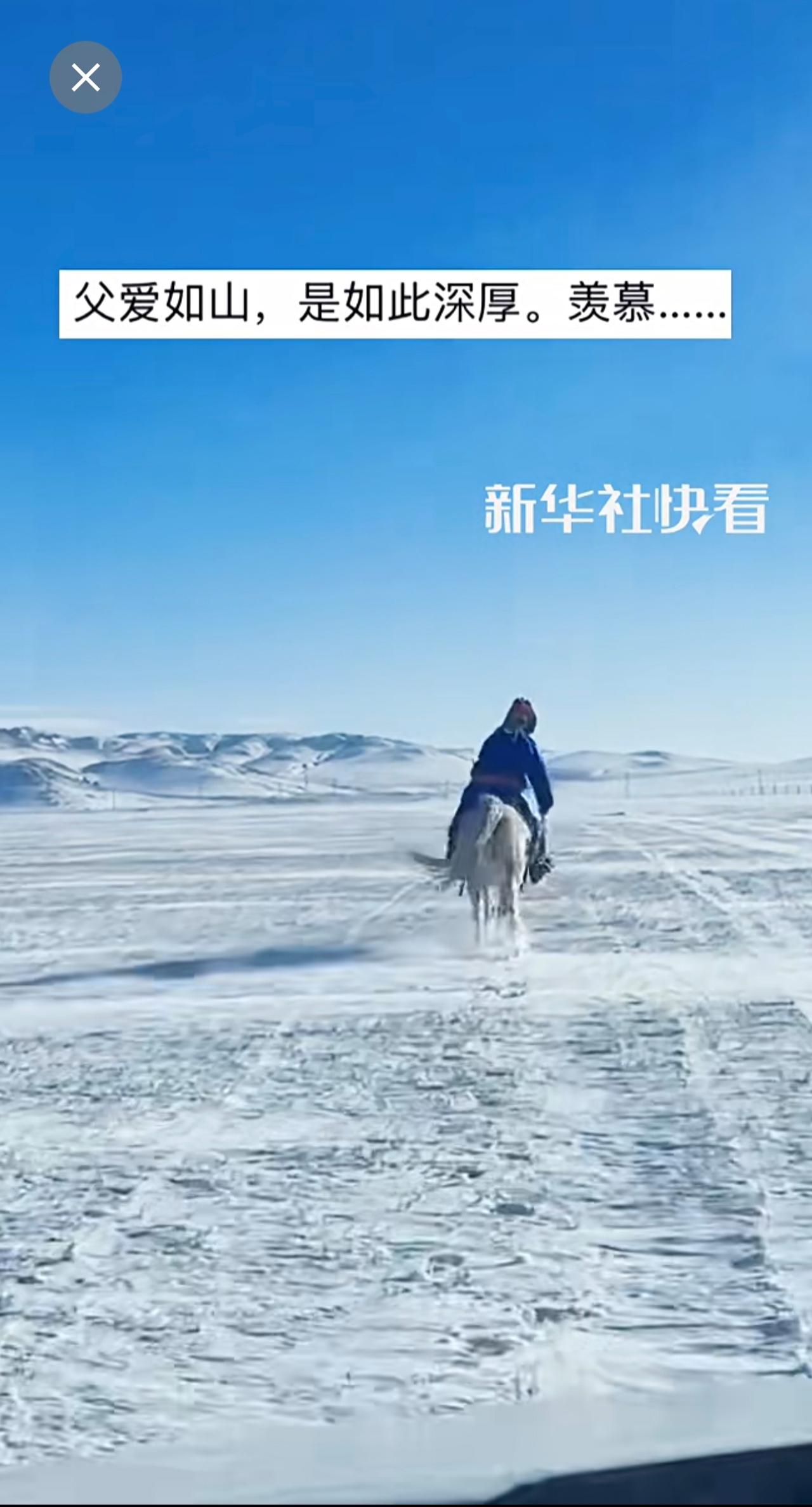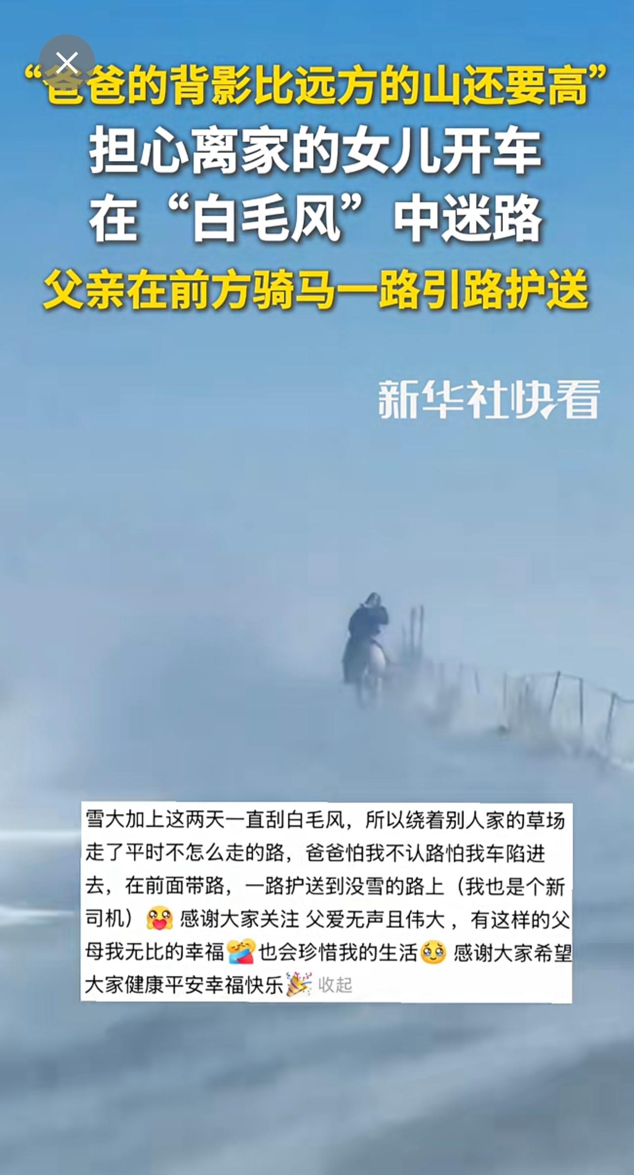 “爸爸的背影比远方的山还要高”,担心离家的女儿开车,在“白毛风”中迷路,父亲在前方骑马一路引路护送。