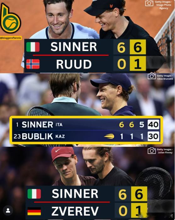 辛纳今年三次横扫比分,你们印象最深是?辛纳6-0/6-1鲁德辛纳6-1/6-1/6-1布勃利克辛纳6-0/6-1兹维列夫热点现场
