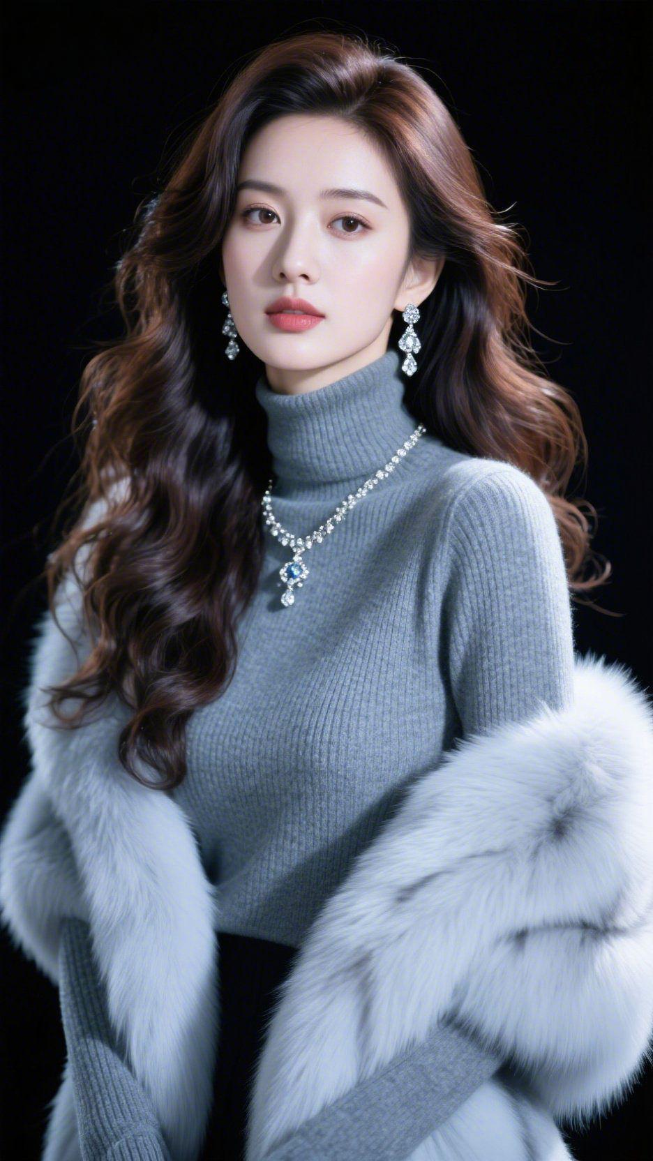 《浅灰里的柔暖序章》 她身上的浅灰,是把冬晨的雾揉进了针织纹路里。软糯高领轻贴颈线,像被云絮轻裹的暖,衬得眉目是浸了柔的湖——眼波轻抬时,连耳尖垂着的碎钻都漫开了温软。 该是晚风初起的时刻吧?绒毛披肩沾着夜的软,颈间蓝钻像藏了星子的光,她就那样立着,把“静”晕成了眼前的模样。不是冷调的淡,是妥帖的柔,像壁炉边刚焐热的绒毯,是你某回抬眼撞见的、恰好落在肩头的轻暖。 原来最动人心的从不是张扬,是这素净色调里,有人把寻常姿态,织成了心上的一帧温柔。 浅灰柔暖感 冬日优雅氛围