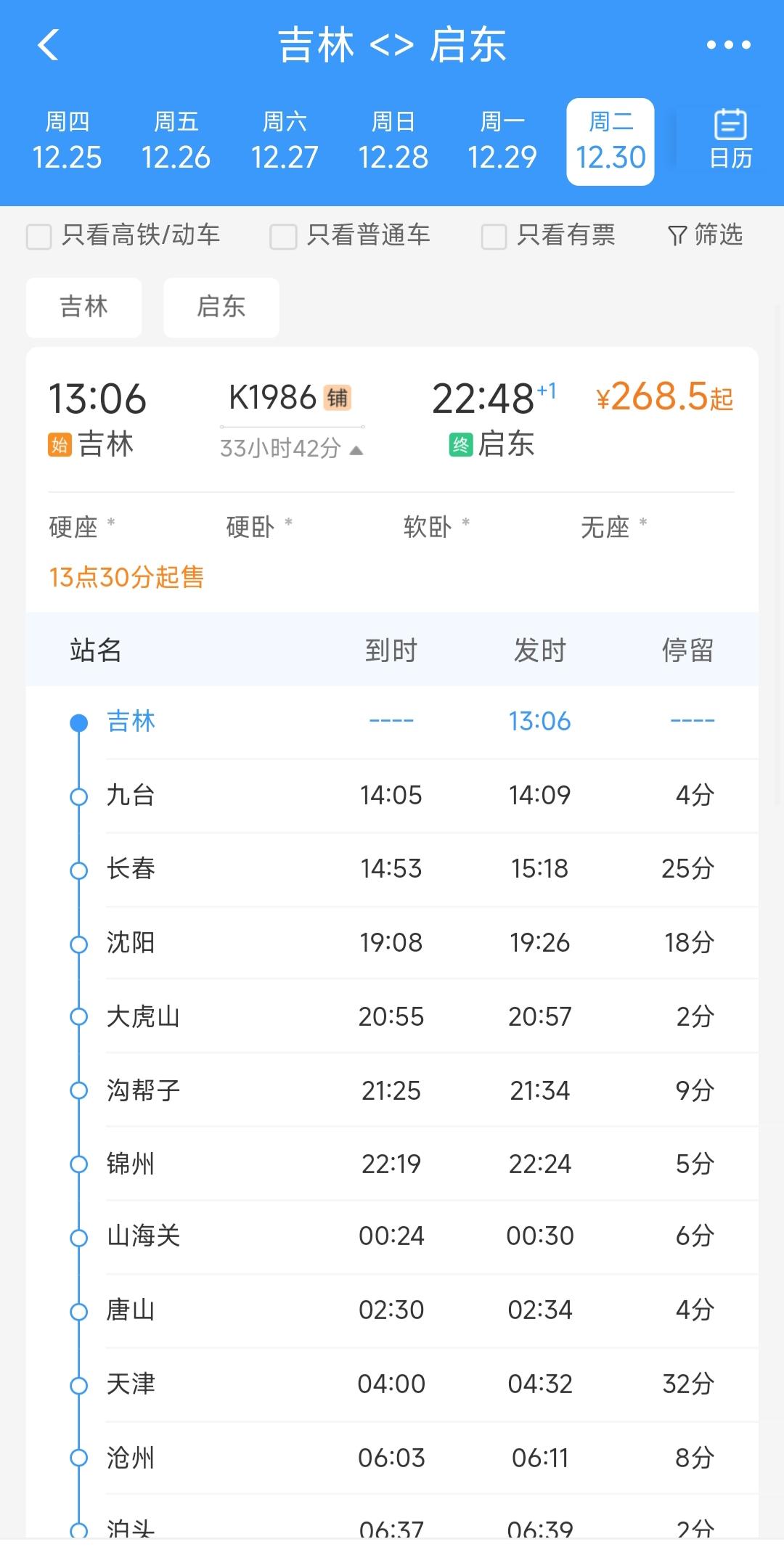还是要恭喜恭喜长春、吉林。从12月30日开始吉林到启东的K1986次绿皮车正式恢复客运,今天下午1:30开始正式售票。 这样的话在南通、扬州、泰州,蚌埠、宿州、徐州上班的东北人终于可以乘坐绿皮车回家了,同时也能为到即将东北旅游的安徽人、江苏人提供便捷的交通配套,仔细想想这或许就是最好的双向奔赴。