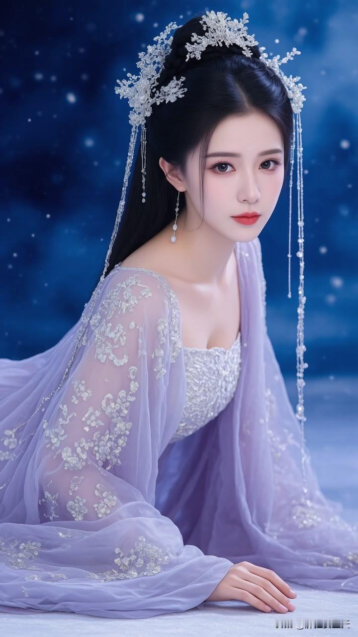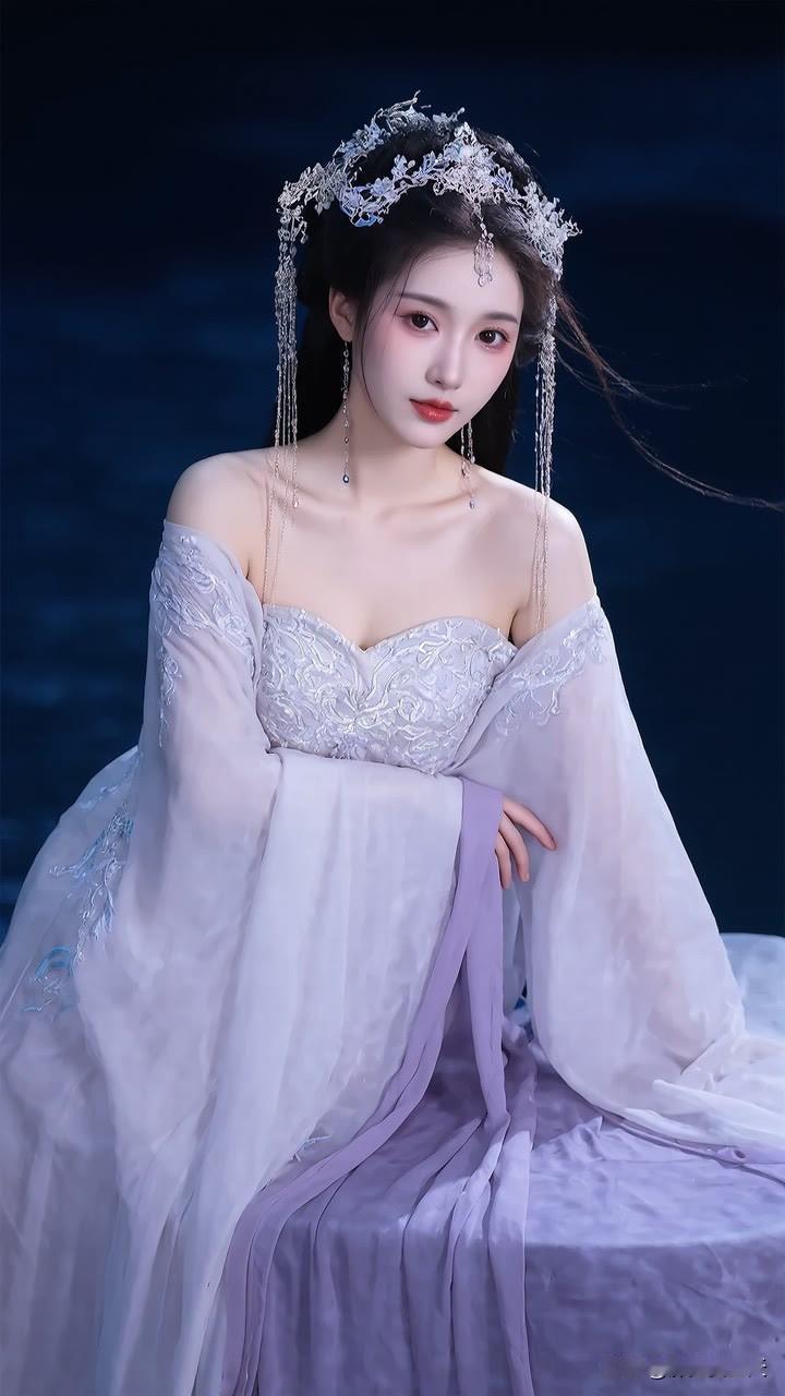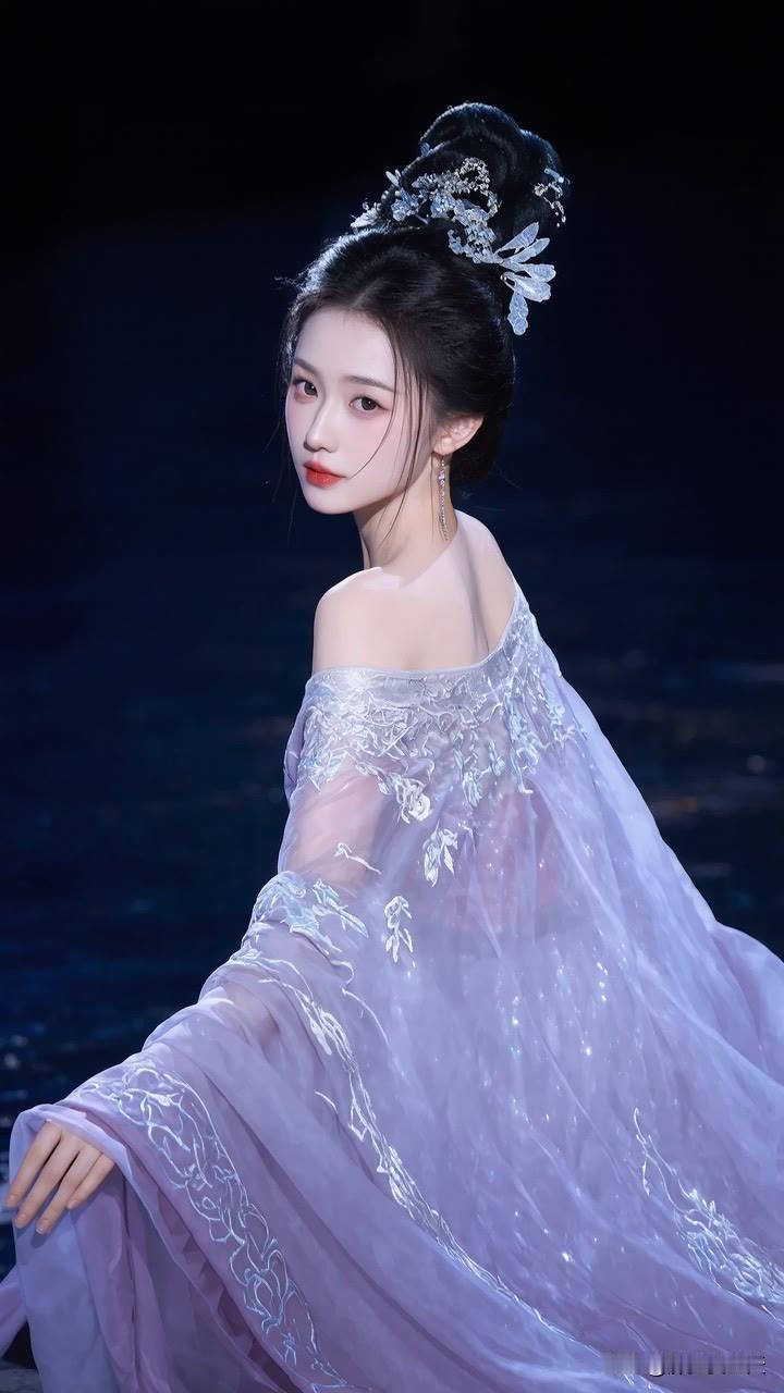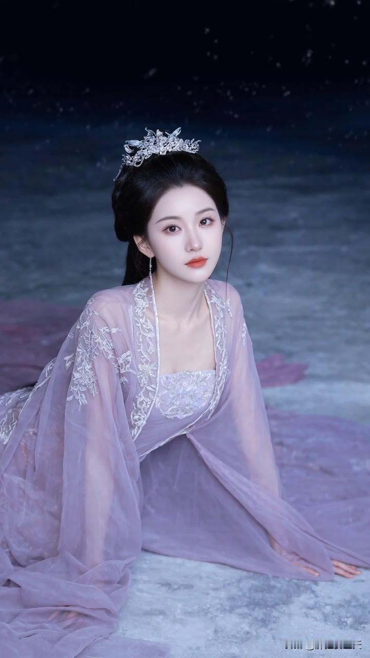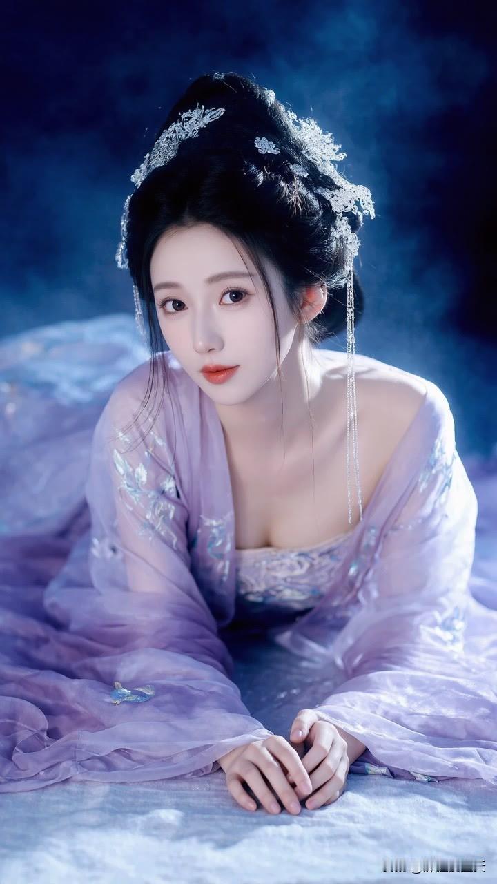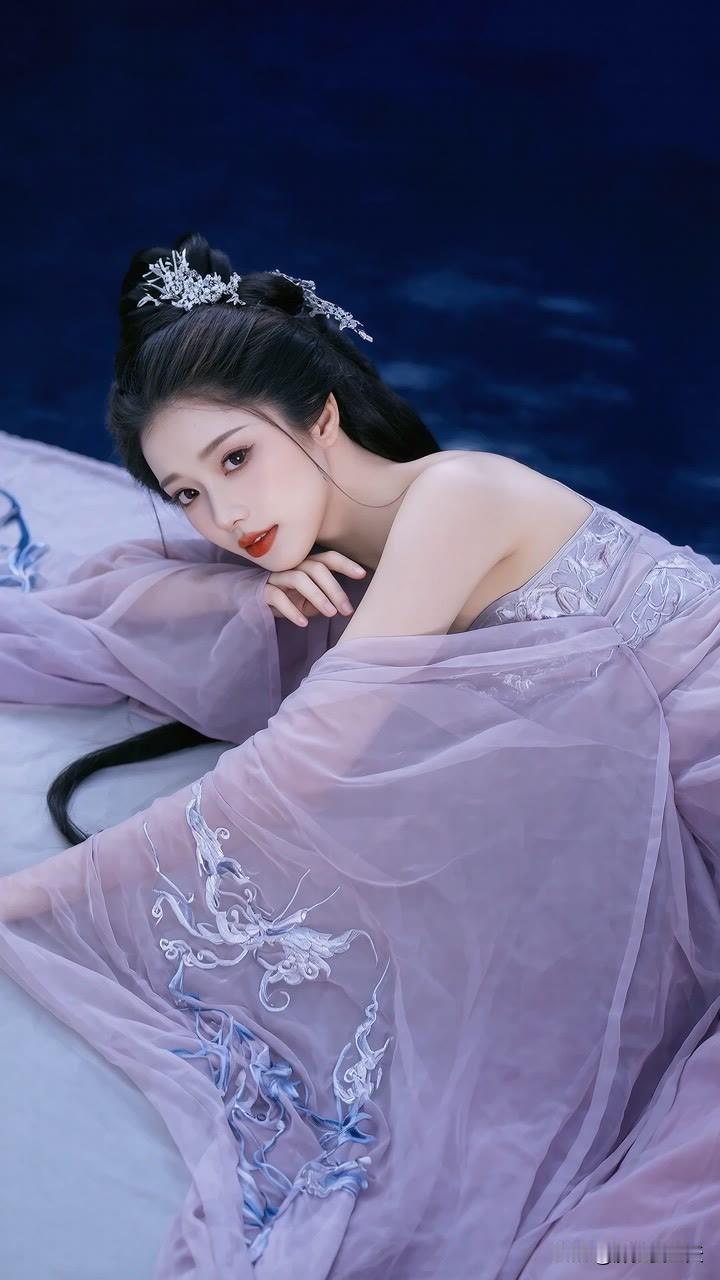 她身着紫色刺绣纱质古睡衣,轻纱漫卷,绣纹精巧,似在低诉古韵。奶白肌肤胜雪,精致锁骨线条旖旎。国风古代美人