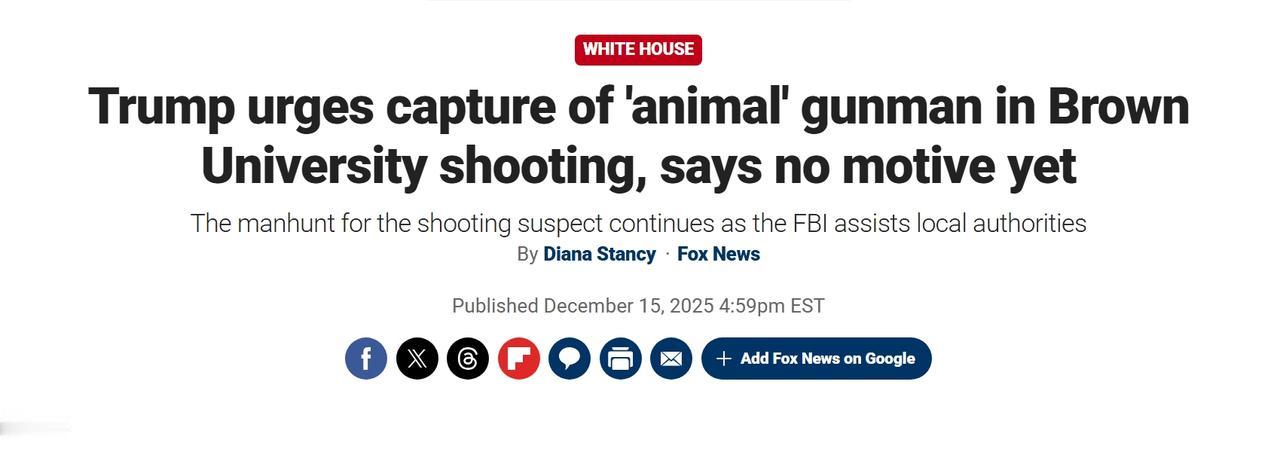 美国布朗大学枪击案嫌疑人仍然在逃,特朗普称是学校的责任 周六在罗德岛布朗大学造成2死9伤大规模枪击事件的嫌疑人仍未落网,联邦调查局已参与协助,目前尚未确定涉嫌枪手的动机。 事发后警方最初在罗德岛一家酒店拘留了一名男子,声称与枪击案有关,但当局周日宣布已释放该男子,继续追捕嫌疑人。 特朗普周一对记者说:“我们拭目以待,希望他们能抓住这只动物。” 当被问及为何联邦调查局(FBI)协助地方执法部门调查此事,却仍然难以识别嫌疑人时,特朗普表示,这总是很难,问题出在学校。 特朗普说:“这是学校的问题。他们有自己的警卫,他们有自己的警察,什么都有。这个问题你得问学校,而不是FBI。我们事后才介入,联邦调查局会做得很好,但他们是事后才介入的。”