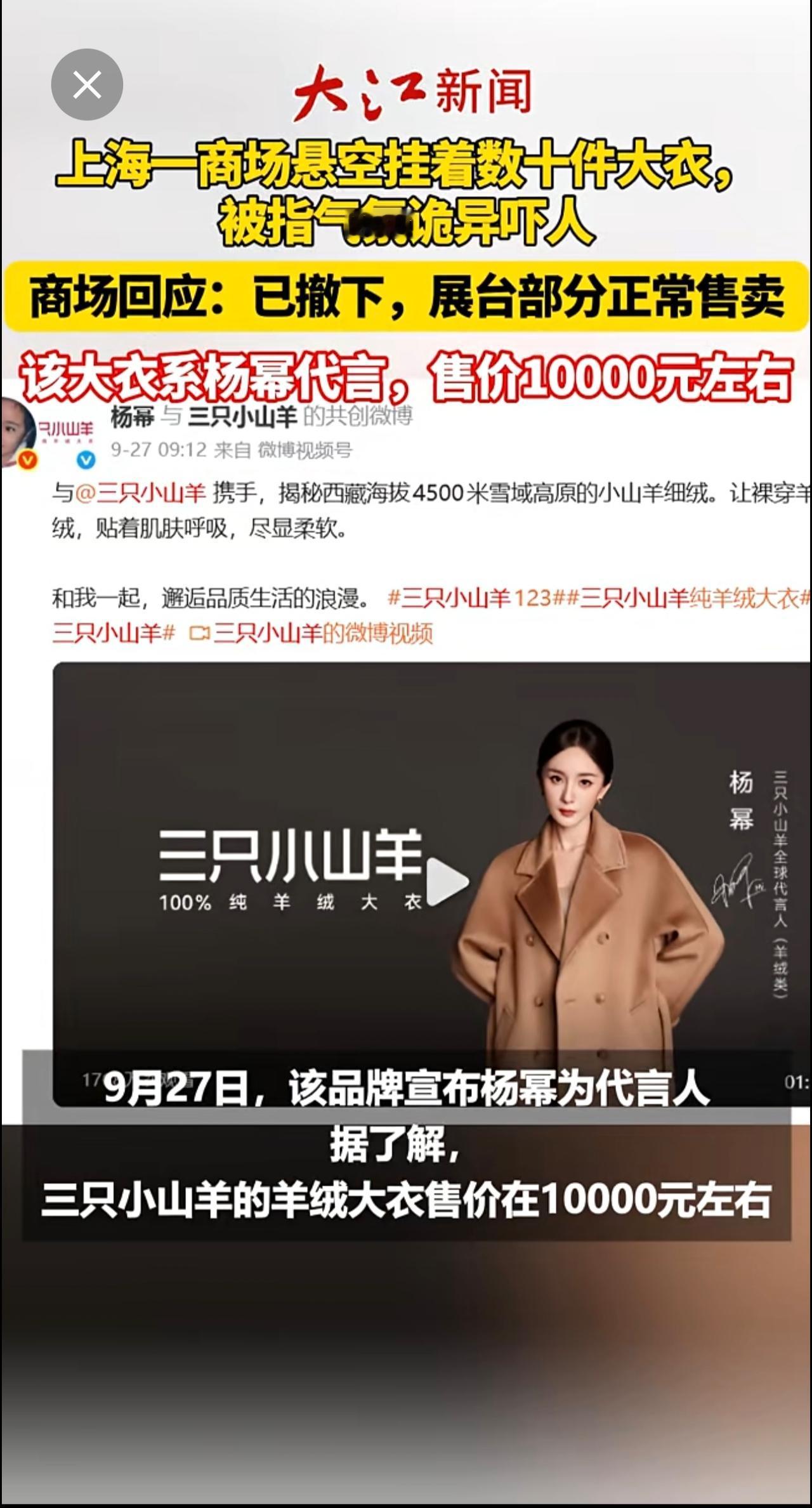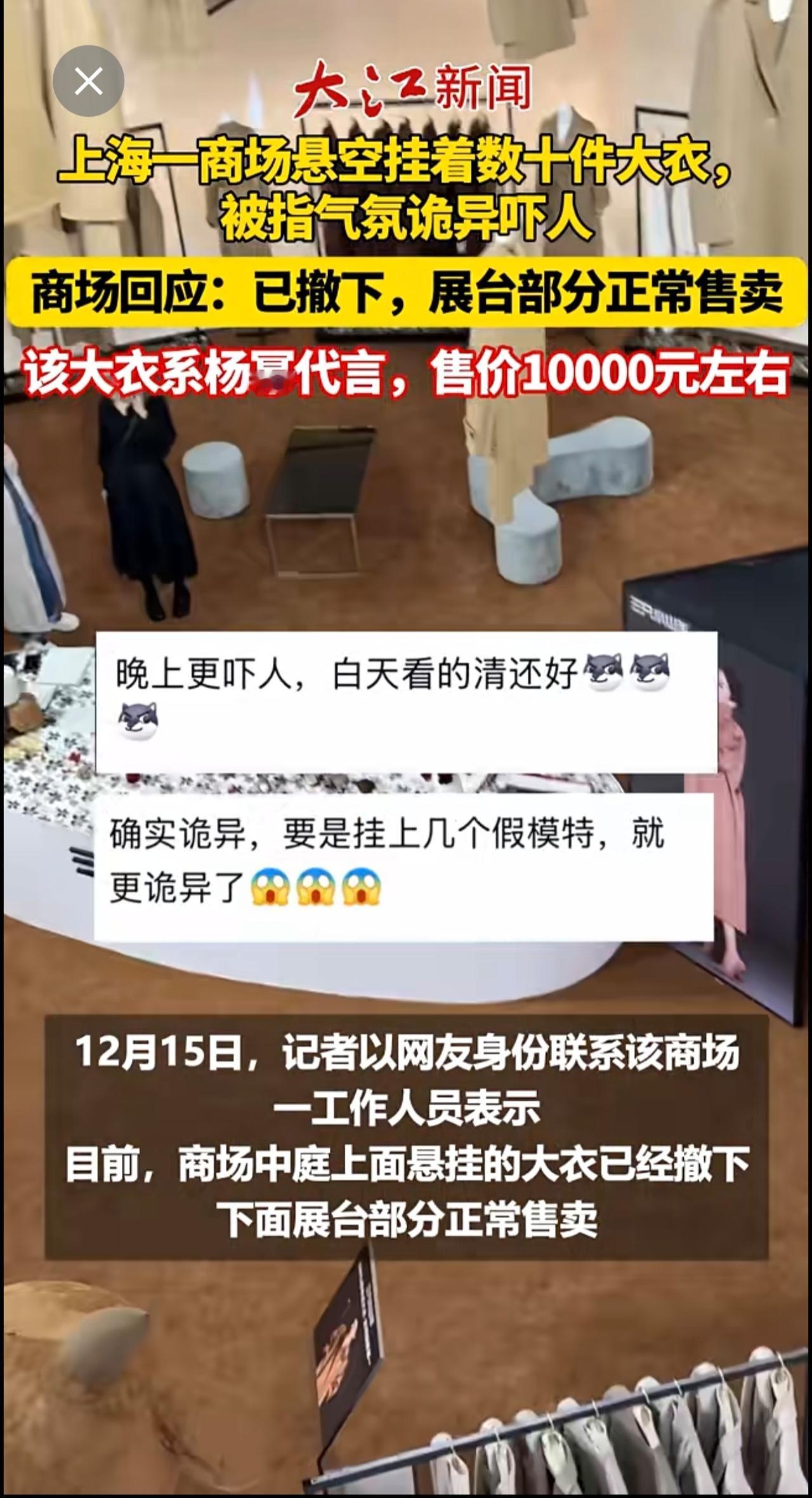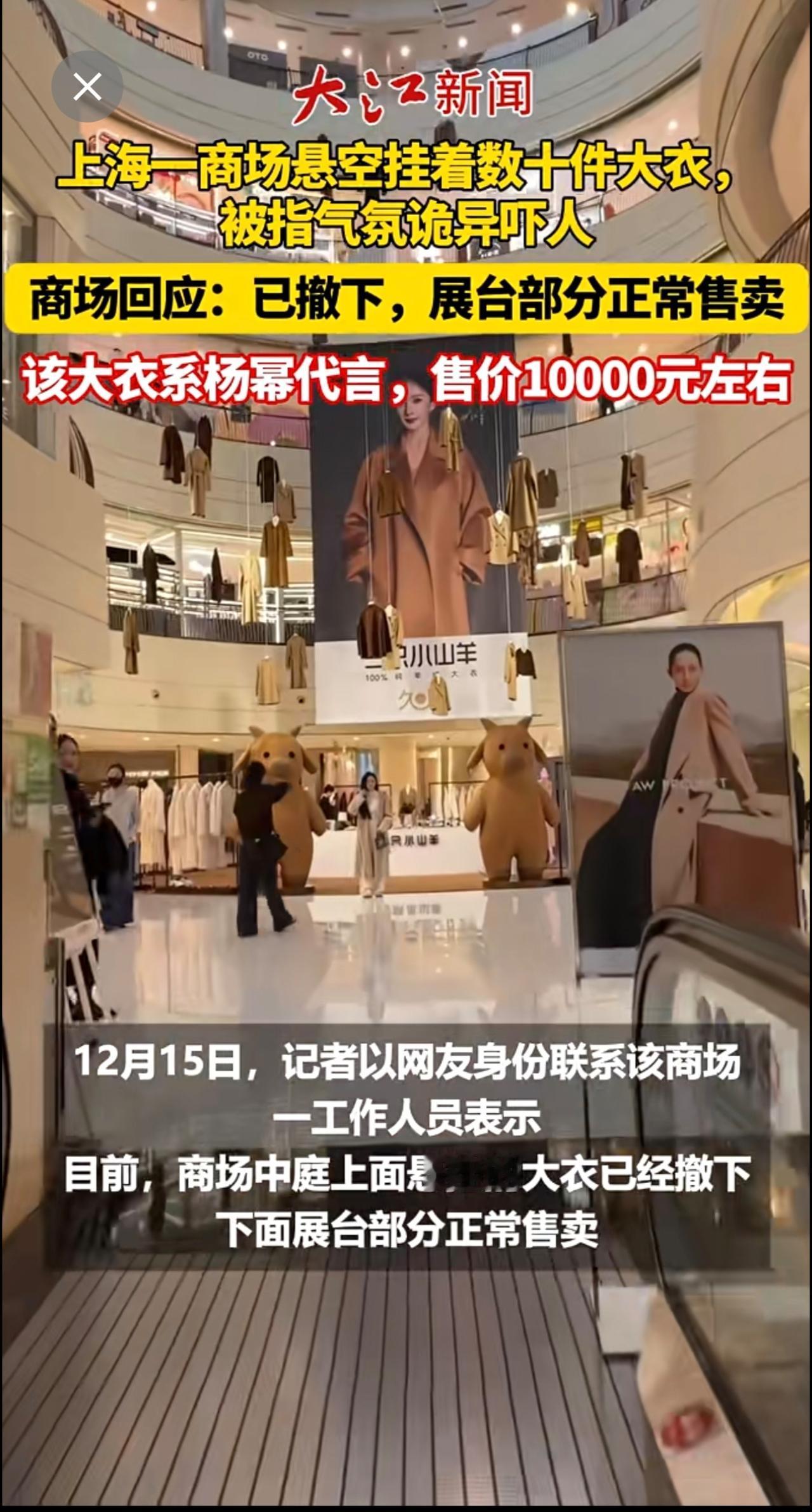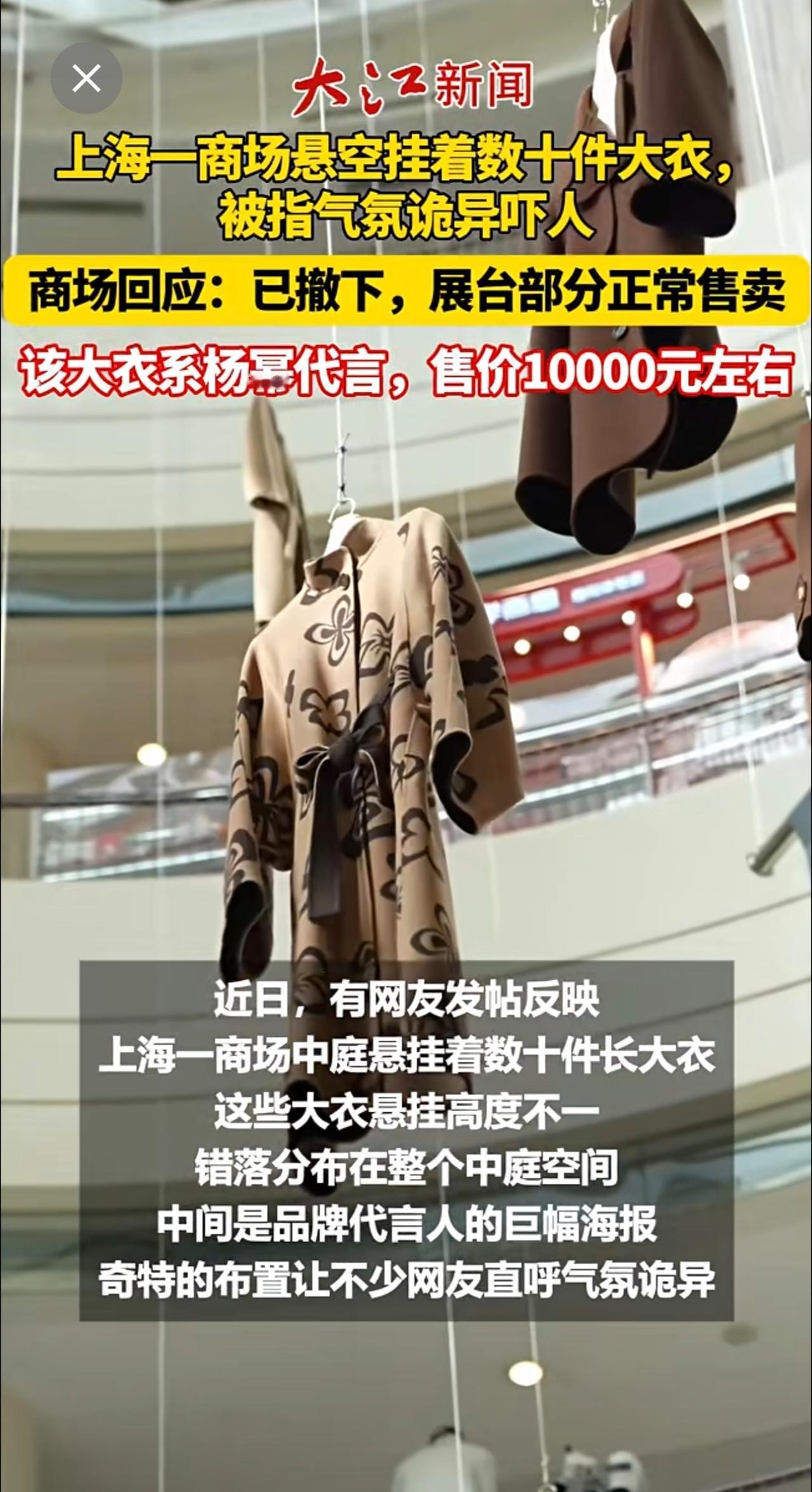 上海一商场悬空挂着数十件大衣,被指气氛诡异吓人。商场回应:已撤下,展台部分正常售卖