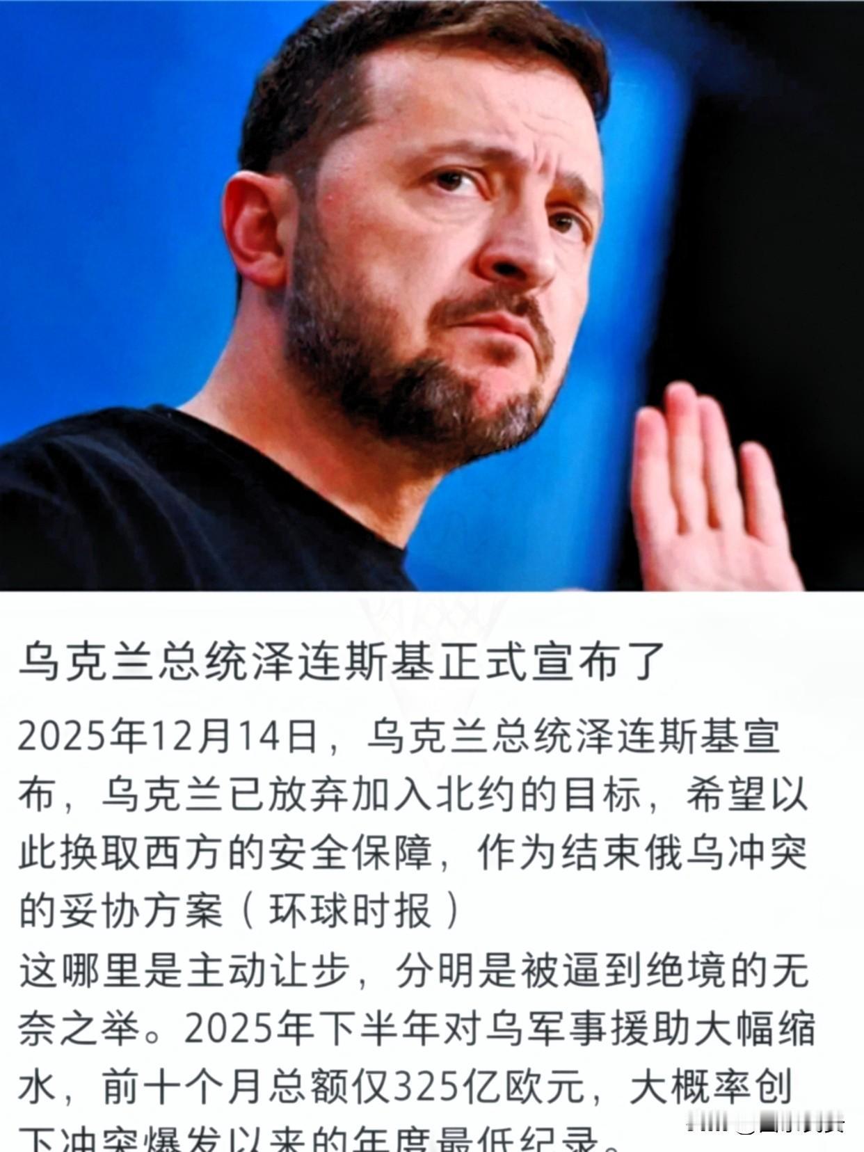 新闻!快讯 乌克兰总统正式宣布放弃北约 12月16日泽连斯基宣布放弃加入北约,换取西方安全保障想法。 这是乌克兰为“入约”奋斗三十年后做出的无奈选择。 北约2008年曾表示乌克兰有资格加入,但并未接纳乌克兰。 泽连斯基想要的安全保障悬而未决,美方只表示在柏林谈判中“取得进展”,欧洲内部对援助方案也存在分歧。 持续冲突中,乌克兰由主动变被动,面临领土争议和民众质疑。 泽连斯基承认和平计划中有各种妥协,但未来的公平性和落实情况未知。 乌克兰谈判的主动权并不在自己手中,令人担忧的是,战争中失去家园的乌克兰人安全,由谁来保障? 乌克兰这三十年入约梦碎也太让人唏嘘了!本来想着抱北约大腿求安全,结果人家2008年给个口头承诺就没下文了,把它架在火上烤。 现在泽连斯基不得不放弃诉求换保障,可西方援助分歧大,安全承诺还没谱。 说到底,小国在大国博弈里就是容易被拿捏,想靠别人护着根本不现实,自身硬才是真的硬,不然再美的期待也会落空。 各位读者你们怎么看,欢迎评论区讨论北约 北约战略失败
