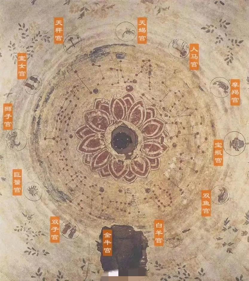 辽代中原古墓壁画有十二星座。张世卿墓葬群天文图。1972年,河北发现了一个辽代古墓群。考古专家在当地的挖掘工作,从1972年开始,直到1993年才告一段落。 古墓的具体位置在河北省张家口市河子乡下八里村。这个地方有十几座辽代的张氏家族古墓。其中,最有名气的是张世卿墓。在这20多年里,考古工作者对张世卿墓为代表的 10余座辽代墓葬群,进行保护性挖掘,一共出土了800多件珍贵文物。 此外,专家还发现了360平米的壁画。其中,最令考古专家惊讶的是,墓室的上方,居然有一幅天文图,上面的图案,跟十二星座一一对应。 现在常说的十二星座,发源于古巴比伦。古巴比伦一开始设计的十二宫,并没有直接流传到中国。这个划分方式被传到了希腊,因为入乡随俗的缘故,古巴比伦划分的十二宫,在希腊境内跟神话结合到了一起,逐渐演变成了后人常说的十二星座,相传隋唐时期传入我国。辽代公主墓 河北古代壁画展 辽阳汉魏壁画墓