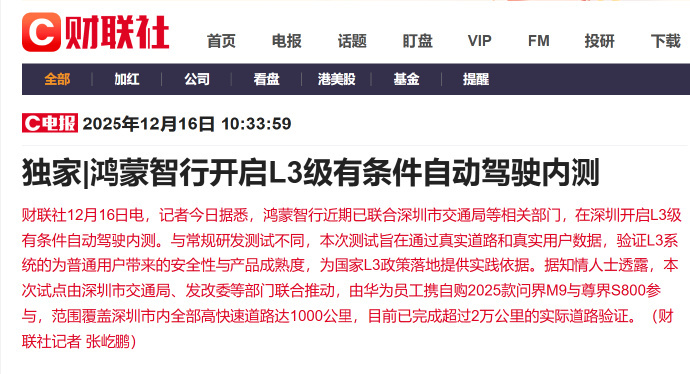 鸿蒙智行正在进行L3级有条件自动驾驶内测 12月16日,据财联社报道,鸿蒙智行近期已联合深圳市交通局等相关部门,在深圳开启L3级有条件自动驾驶内测。与常规研发测试不同,本次测试旨在通过真实道路和真实用户数据,验证L3系统为普通用户带来的安全性与产品成熟度,为国家L3政策落地提供实践依据。鸿蒙智行开启L3级有条件自动驾驶测试据知情人士透露,本次试点由深圳市交通局、发改委等部门联合推动,由华为员工携自购2025款问界M9与尊界S800参与,范围覆盖深圳市内全部高快速道路达1000公里,目前已完成超过2万公里的实际道路验证。